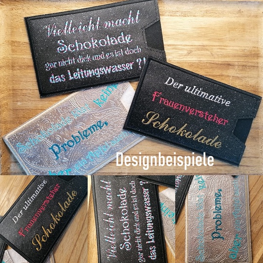 Verpacke deine Schoki 100 Gramm-Tafeln (ca. 16x8 cm) in diese Hüllen, die alle mit einer Message verbunden sind. Ideal für ein Mitbringsel für einen Patienten, für deine Freundin als Tröster oder einfach so mit einem coolen Spruch. Ganz persönlich wird es wenn du bei der Blanko-Hülle einen Namen in den Rahmen stickst.