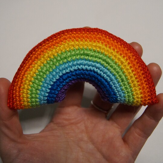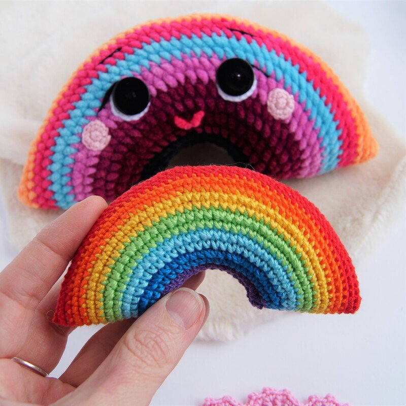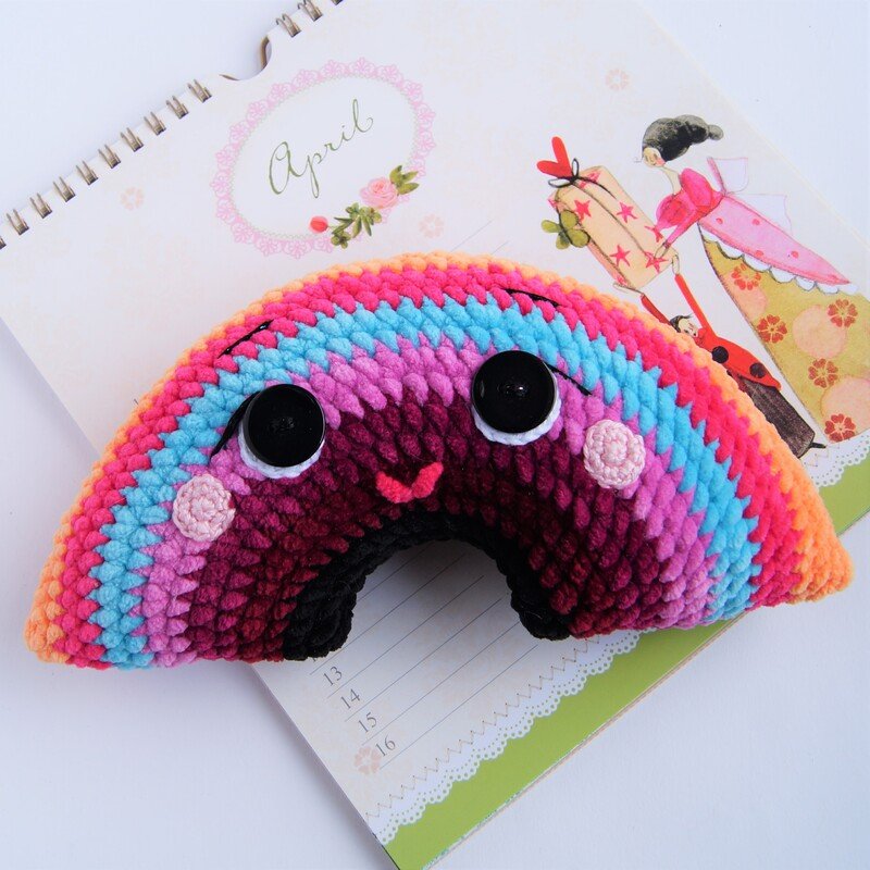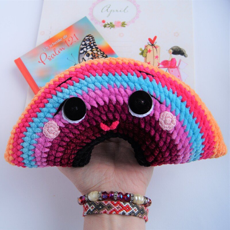 Den Regenbogen kann man wunderbar in Mobiles verarbeiten oder aber, aus Plüschwolle gehäkelt, eignet er sich zum Kuscheln und liebhaben. Auf Wunsch kann man dem Regenbogen ein Gesicht gestallten, dabei sind der Fantasie keine Grenzen gesetzt.