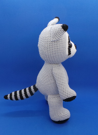 Mit einem Baumwollgarn 50g/125m und Häkelnadel 2,5mm gehäkelt wird er etwa 24cm groß. Du kannst den Waschbär mit jedem anderen Garn/Wolle häkeln, mit entsprechender Nadelstärke für das von dir verwendete Garn/Wolle. Je nach dem, wie dick oder dünn dein Garn/Wolle ist und wie fest oder locker du häkelst, wird die Figur kleiner oder größer ausfallen.
