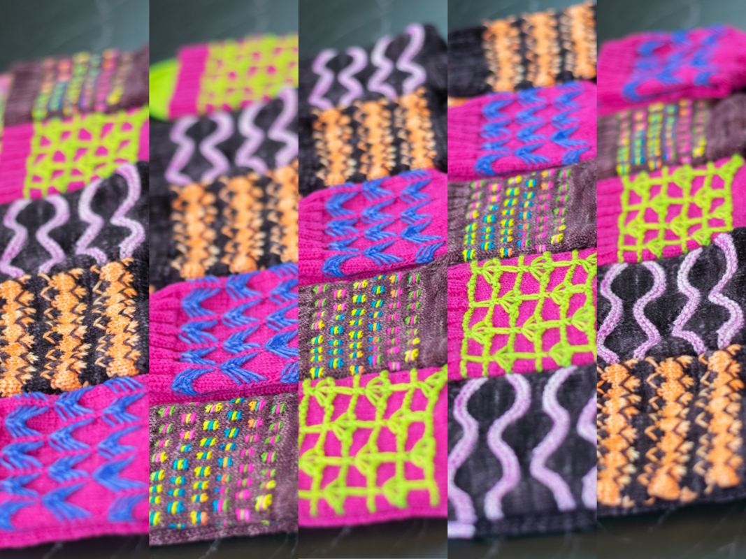 4 der Muster bestehen aus Hebemaschenmustern, das fünfte (das mit den rosa Wellen) besteht aus verkürzten Reihen.