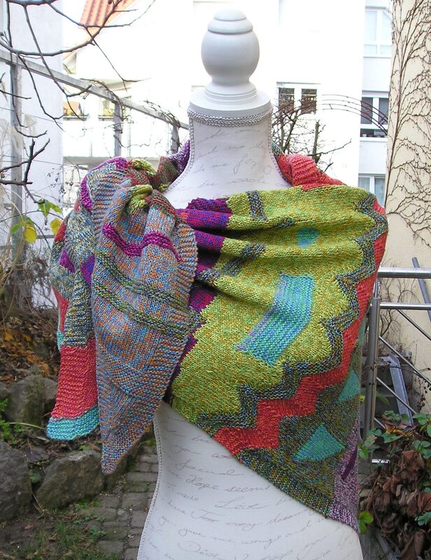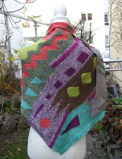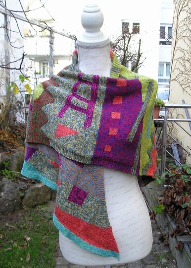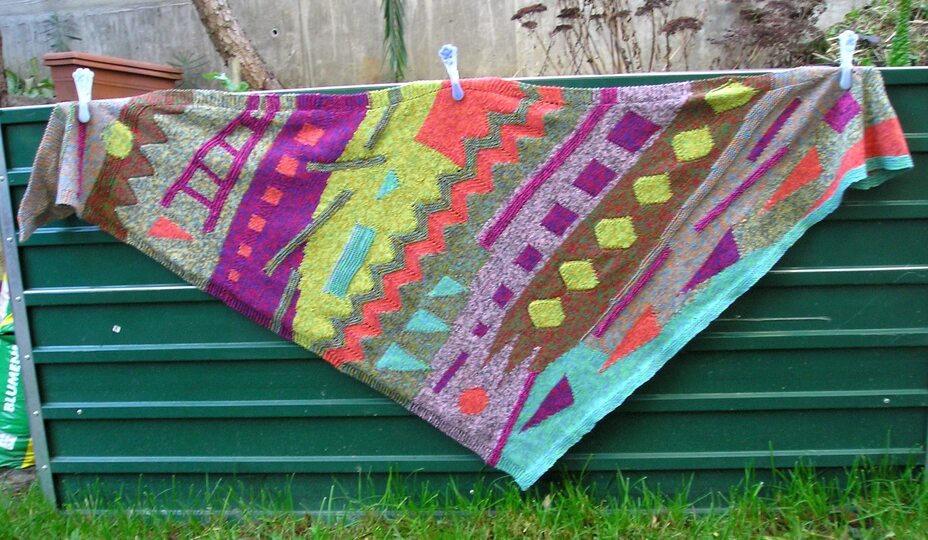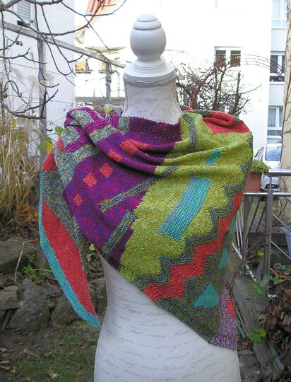handgestricktes Dreieckstuch "Wonderland", Mix aus geometrischen Elementen nach Horst-Schulz-Manier nebeneinander gesetzt