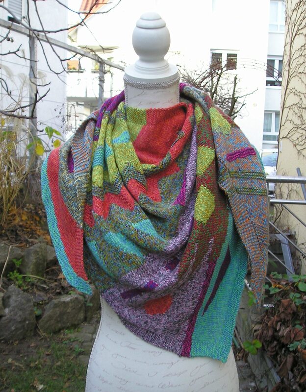 Für das Tuch wird 4-fädiges Baumwollgarn verwendet. Ein Bobbel der Garnmanufaktur wird in seine einzelnen Farben zerlegt und mit diesen ein asymmetrisches Tuch gestrickt. Man kann auch 10 einzelne Unifarben verwenden. Es werden verschiedene geometrische Muster in die einzelnen Farbflächen eingearbeitet. Dabei wird teilweise mit verkürzten Reihen und teilweise mit Aneinanderreihen von Farbfläche nach Horst Schulz gearbeitet. Das ist sehr kompliziert und sehr arbeitsintensiv. Das zu beschreiben war eine echte Herausforderung. Ich hoffe, dass die Anleitung funktioniert und bin dankbar für Eure Hinweise, wenn etwas unklar ist. An dieses Tuch sollten sich nur sehr versierte Stricker*innen heran wagen. Bei Fragen helfe ich (wie immer) gerne weiter.