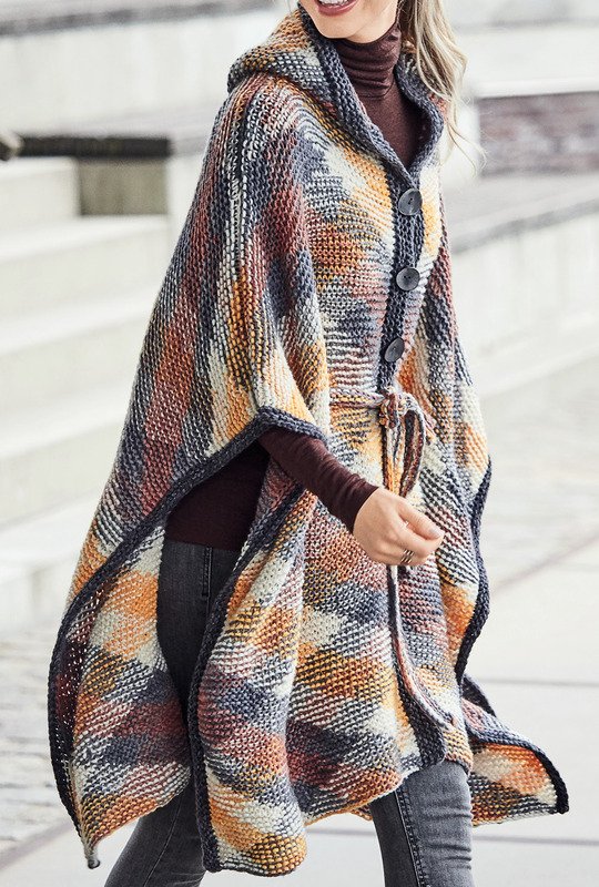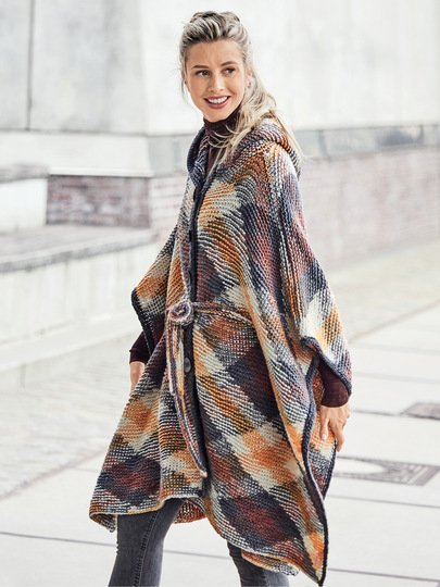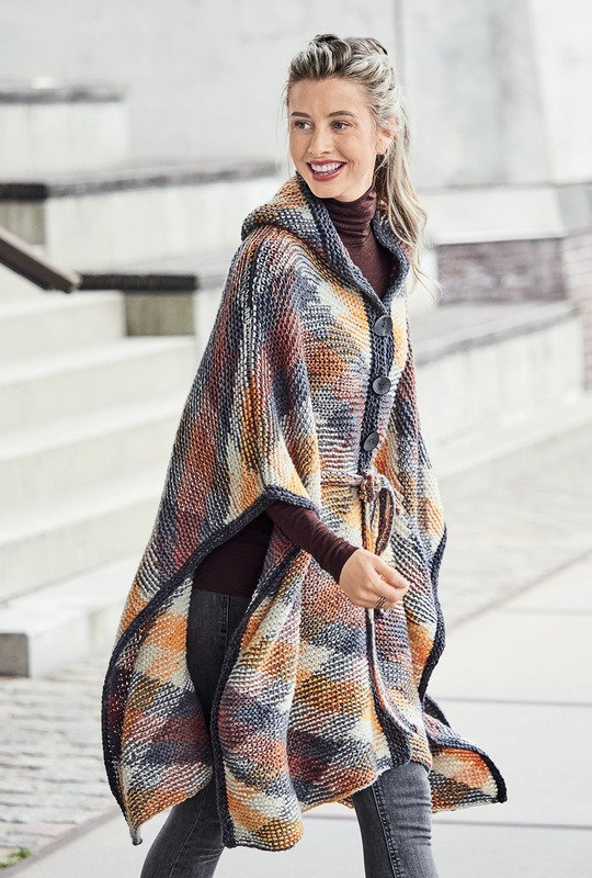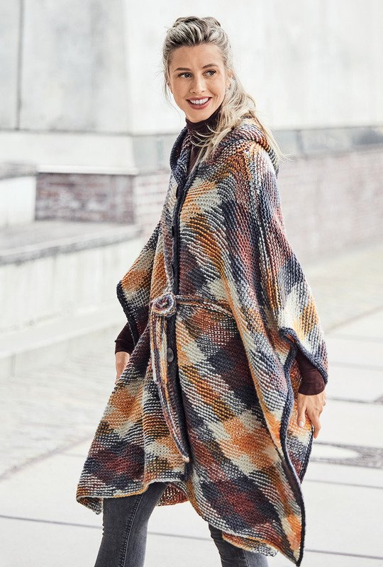 Ein großzügiges Cape mit Kapuze, das für alle Größen passt. Gemacht aus einem Garn, bei dem in Planned-Pooling-Technik das Rautendesign direkt aus dem Knäuel entsteht. Eine Anleitung für diese Technik gibt es auf YouTube, es wird durchweg kraus rechts gestrickt. Farblich haben wir hier die Kombination aus Gelb-, Grau und Brauntönen gewählt (ein echter Trendsetter für den Winter), es gibt aber auch noch andere Farbkombinationen dieses Garns aus einer Mischung von Schurwolle, Baumwolle und Polyamid. Zusammengehalten wird das großflächige Cape mit einem schmalen gestrickten Gürtel. Die Anleitung ist in Einheitsgröße zu beziehen.