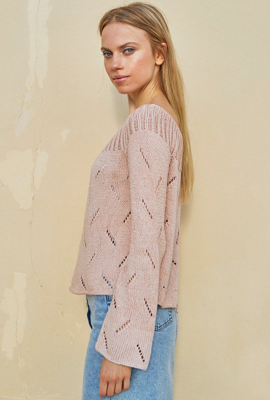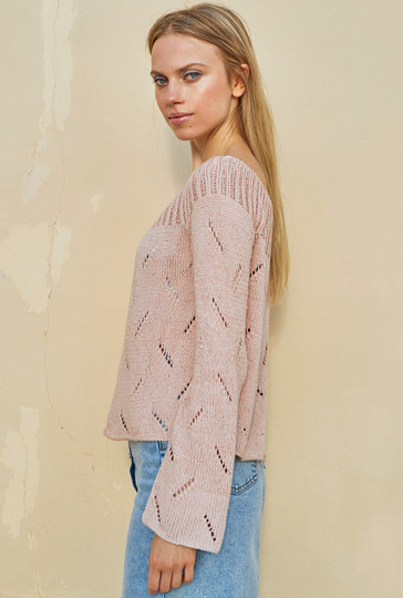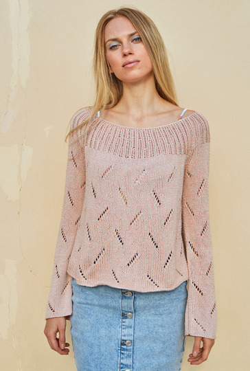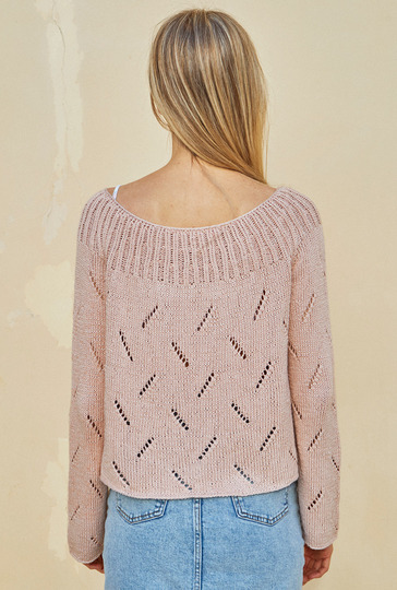 Ganz cool und lässig zeigt sich der puderfarbene Raglanpulli mit seinen diagonal ausgerichteten Ajourstreifen, die allover zum Einsatz kommen. Für Bewegungsfreiheit sorgen die hohen Seitenschlitze. Gestrickt wird der lässige Pulli in Einzelteilen von unten nach oben. Direkt nach dem Maschenanschlag geht es schon los mit dem Ajourmuster. Das ist gar nicht kompliziert und die übersichtliche, klare Strickschrift hilft auch noch dabei, stets den Überblick über die diagonalen Lace-Einsätze zu behalten. Lediglich bei den Raglanabnahmen muss darauf geachtet werden, dass sich die Umschläge und zusammengestrickten Maschen stets ausgleichen. Für die Rundpasse werden Vorderteil, Rückenteil und Ärmel gemeinsam auf die Nadel genommen – ab da geht es dann im Rippenmuster in Runden weiter. Ist alles fertig, werden nur noch die Nähte geschlossen und dabei die unteren Zentimeter für die Seitenschlitze offen gelassen.