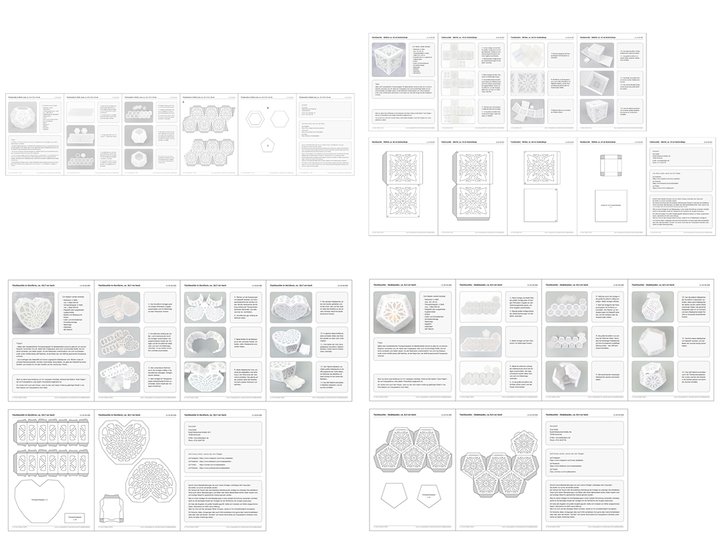 Um diese Tischleuchten nachzuarbeiten, sollst du mit Schere, Cutter und Schneidelineal umgehen können, wissen, wie man Faltlinien einprägt und Grundformen faltet. Auch sollst du bereits mit Fotokarton und Klebstoff gearbeitet haben. Unter diesen Voraussetzungen wirst du diese Schachteln ohne Probleme basteln können.