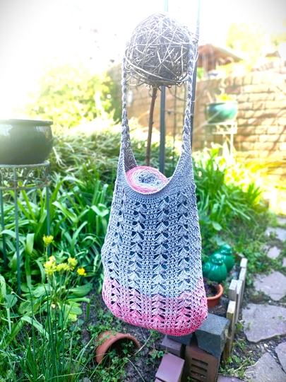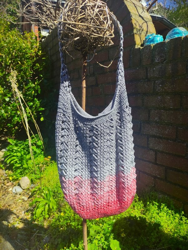 Ich habe hier mit einem 4- fädigen Farbverlaufsgarn und Nadel 3,5 gearbeitet. Meine Tasche hat dabei eine Größe von etwa 31cm Breite, 36 cm Höhe ohne und 48cm Höhe mit Henkel.