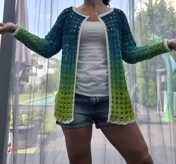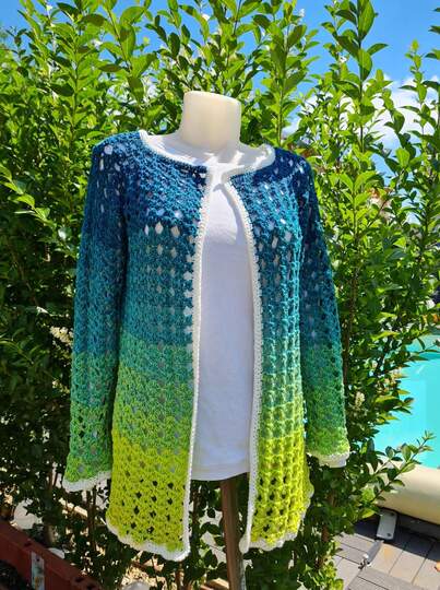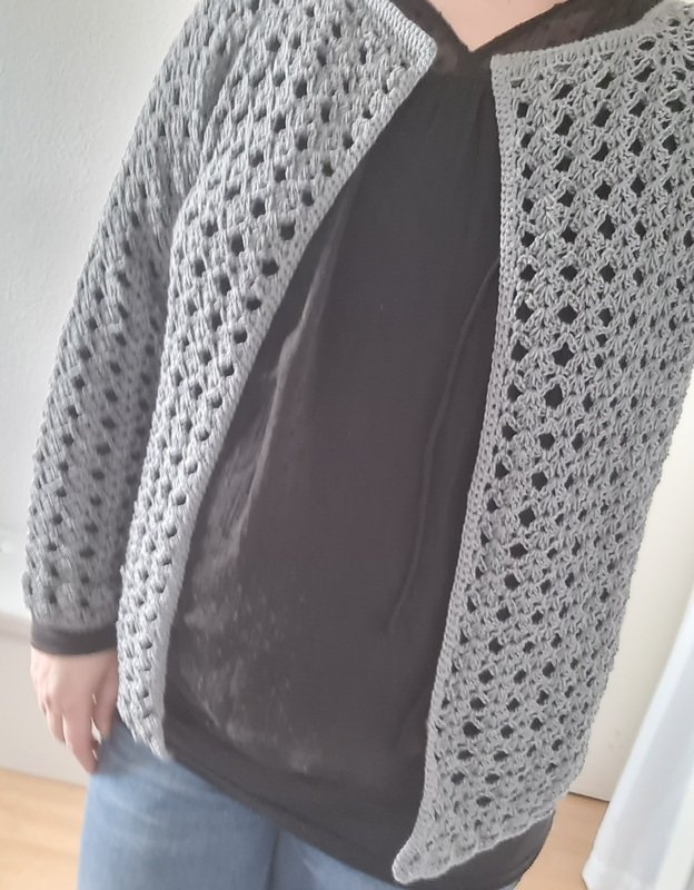 Der abgebildete Cardigan wurde in der Größe 40/42 gearbeitet.