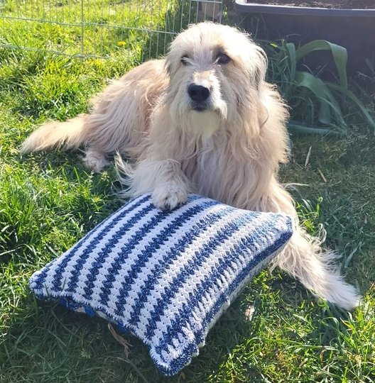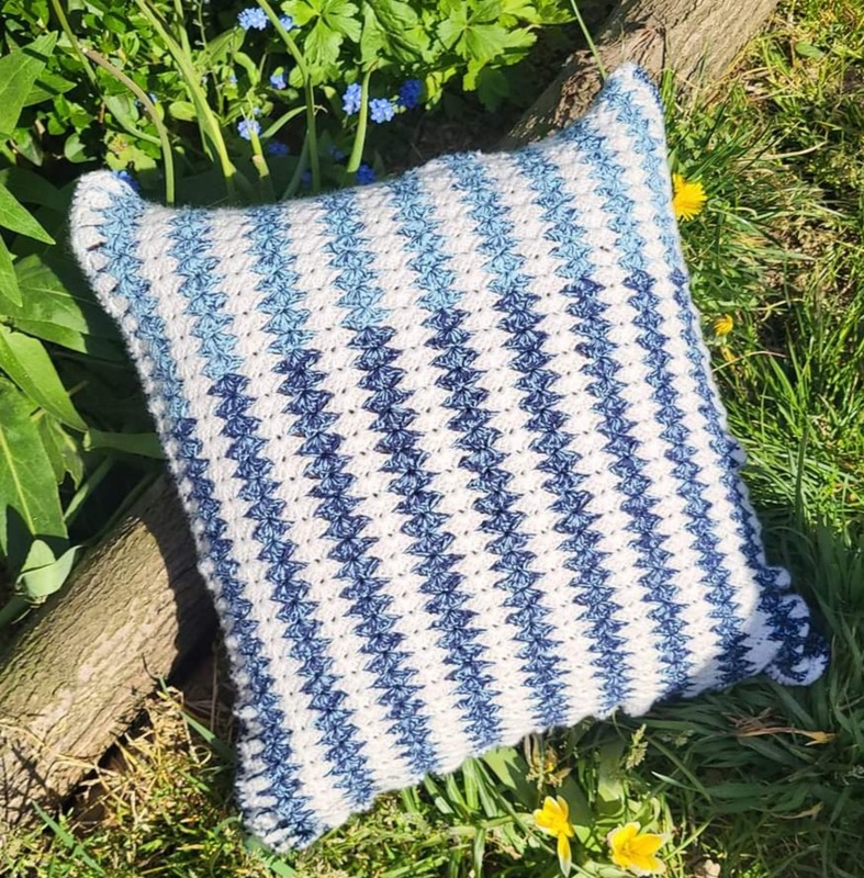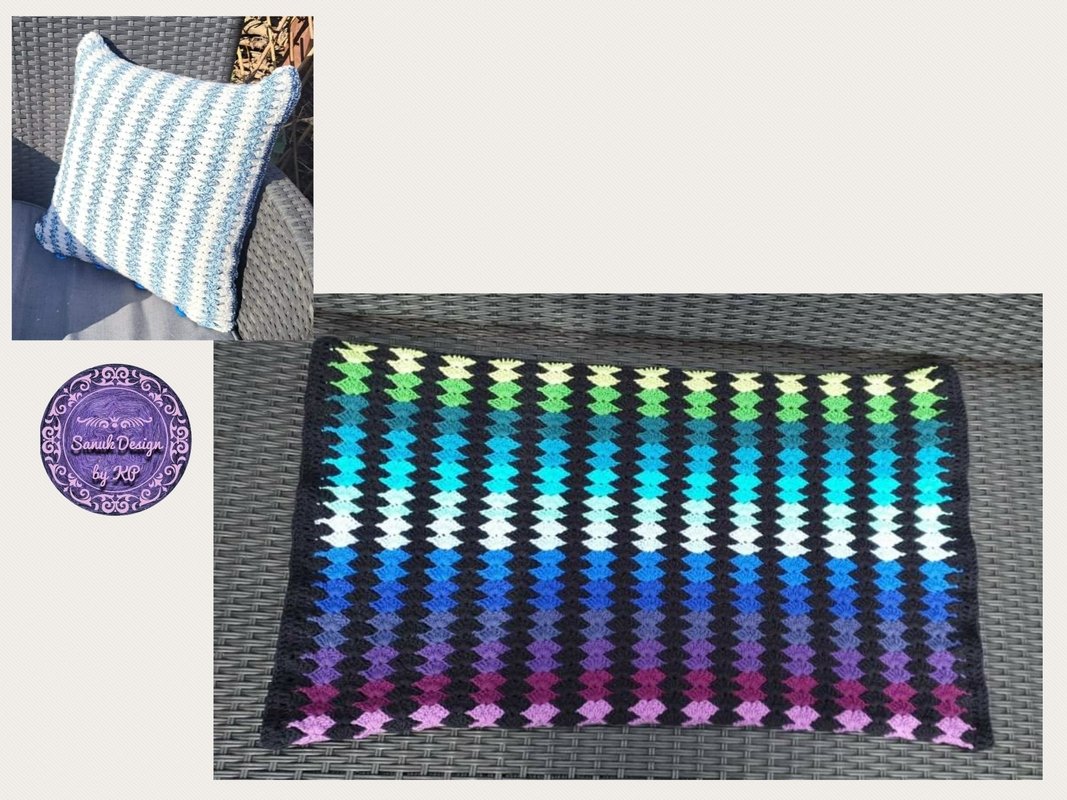 Und für die Kissenhülle 40 x 40 cm wurden 420 m in bunt und 430 m in weiß, mit Nadelstärke 4, verarbeitet, wobei beide Seiten des Kissens gleich sind.