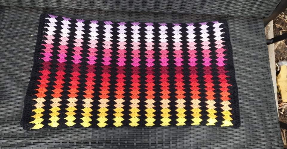 Das Muster ist sehr einfach zu häkeln, es kommen nur Stäbchen und Luftmaschen vor. Und der Farbwechsel, der Faden wird in jeder Reihe gewechselt, ist genau erklärt und bebildert.
