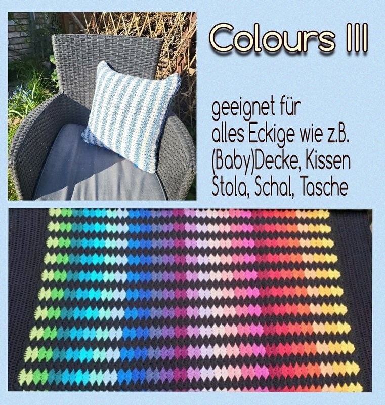 Das Colours III ist für eine (Baby)-Decke oder Stola geeignet, aber auch für alles andere, das quadratisch oder rechteckig gehäkelt wird, z. B. Kissenhülle, Tasche, Pareo oder Schal. Die weiteren Versionen sind: