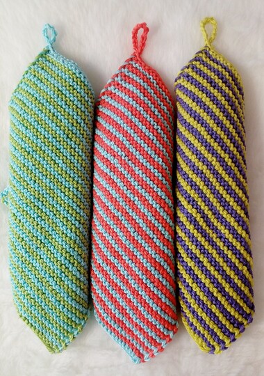 Mit wenigen Grundkenntnissen kannst Du in Deinen Lieblingsfarben tolle Helfer und eine hübsche Dekoration für Deine Küche stricken. Arbeite gleich mehrere davon, dann hast Du immer ein tolles Geschenk für alle Hobbyköche, zum Einzug, Geburtstag, Ostern, Muttertag ...
