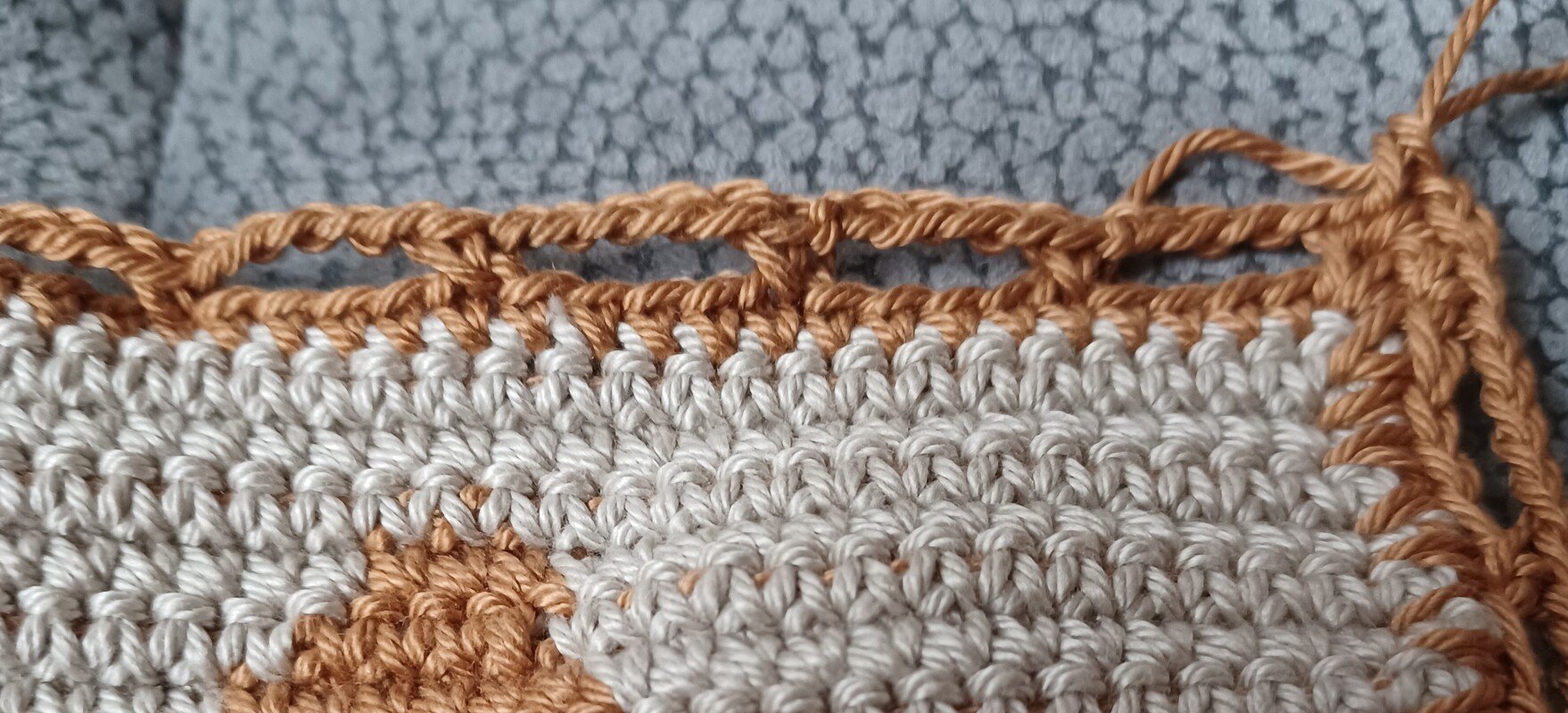 ch habe für 1 Topflappen ca. 35 g je Farbe von WollButt Camilla benötigt, hier habe ich mich für beige und einen goldbraunen Ton entschieden. Auf 50g hat das Garn 125 m.
