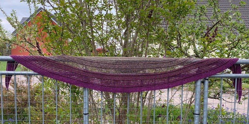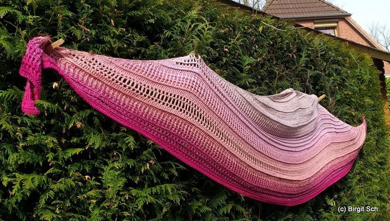 Ich habe mein Sirppi mit einem 1000 m, 3-fädigen Bobbel "Funny Hooks Blaubeere" gearbeitet. Dies ergab mit NS 3,25 mm eine Größe (ungespannt) von 200 x 36 cm