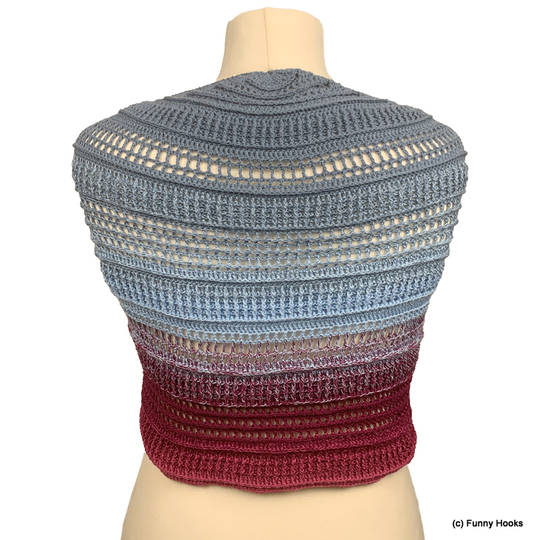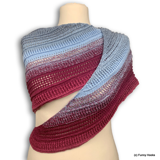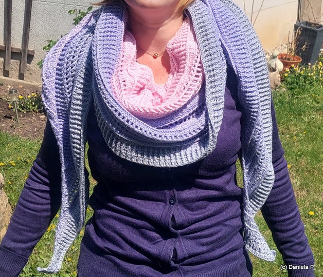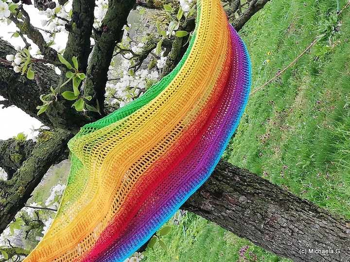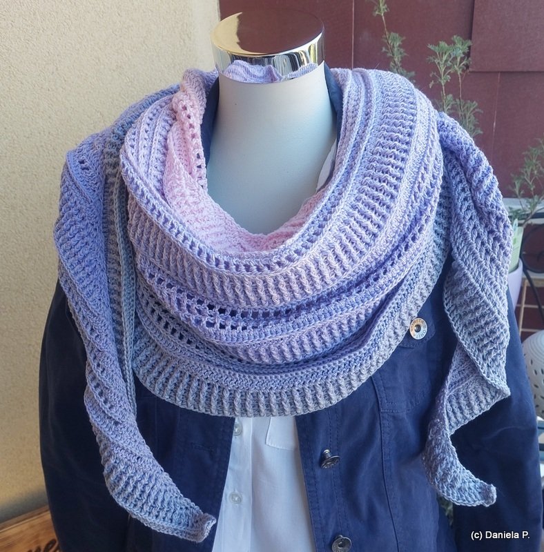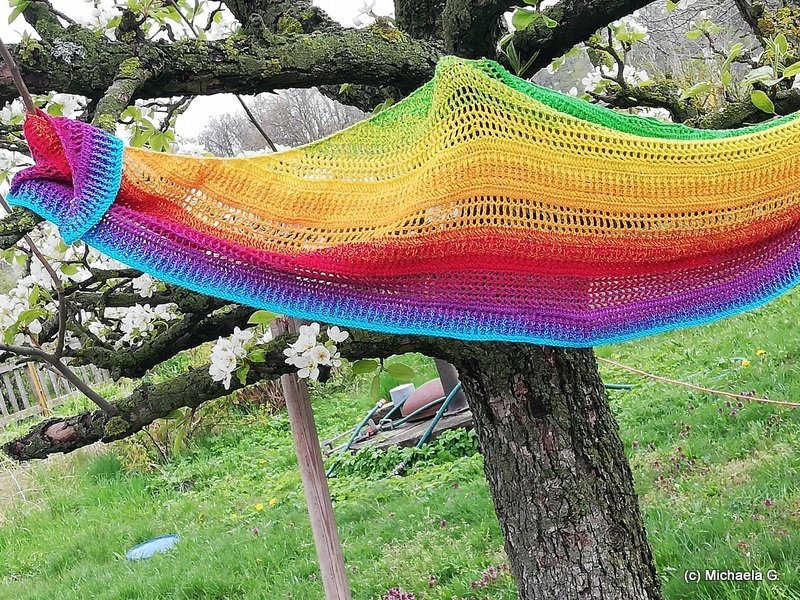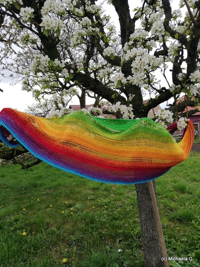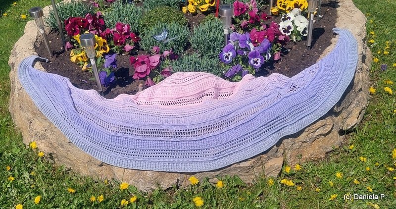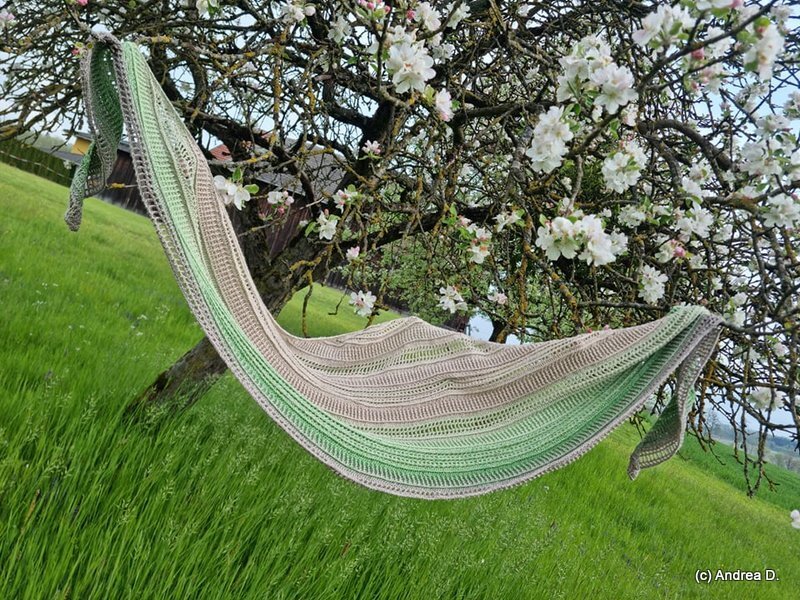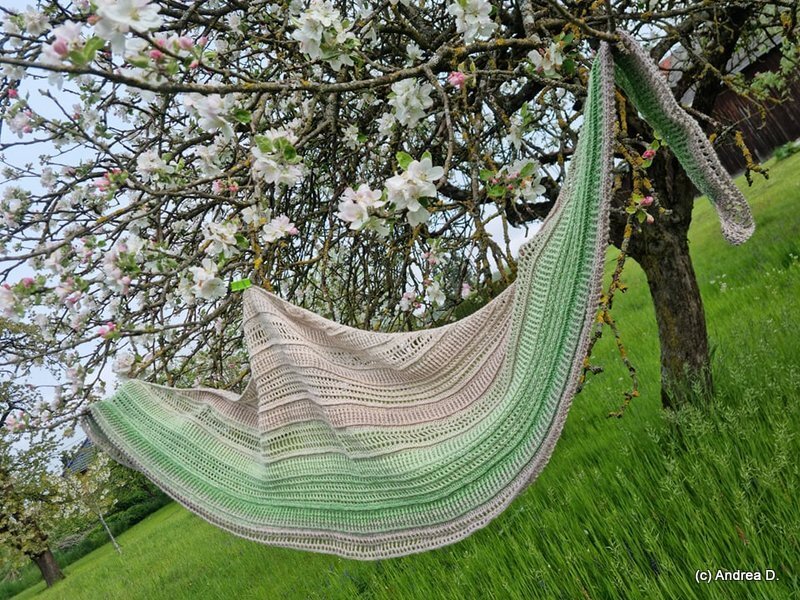 Das Tuch kann in jeder beliebigen Größe gearbeitet werden. Am Ende der Anleitung findet sich eine Tabelle mit den Richtwerten der Testerinnen sowie Fotos von den fertigen Werken.
