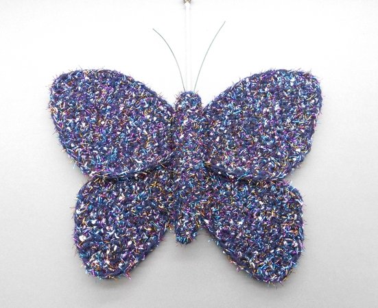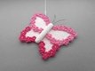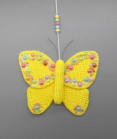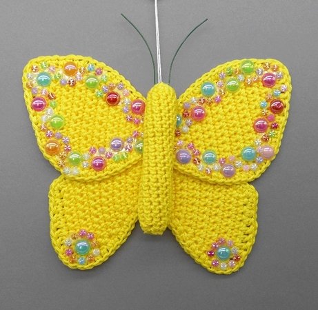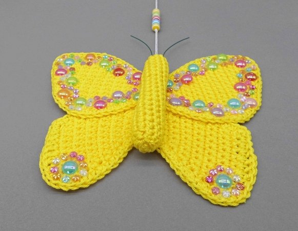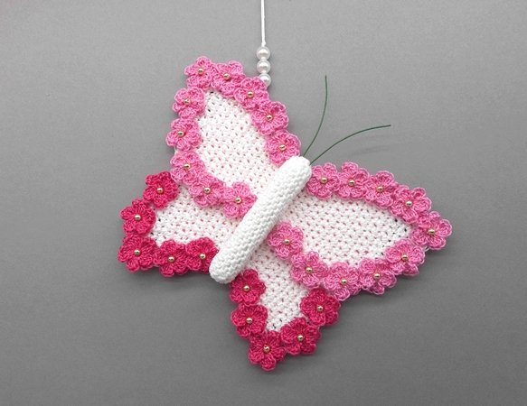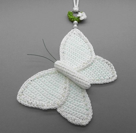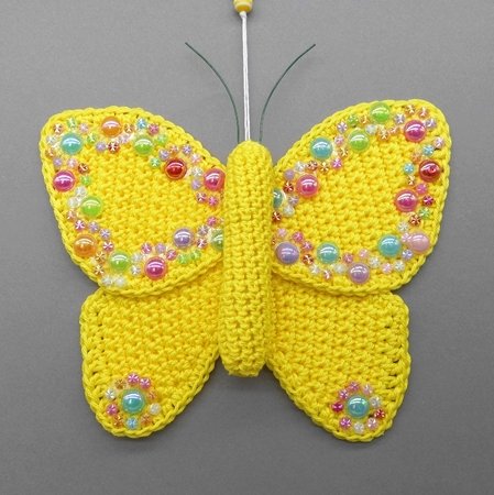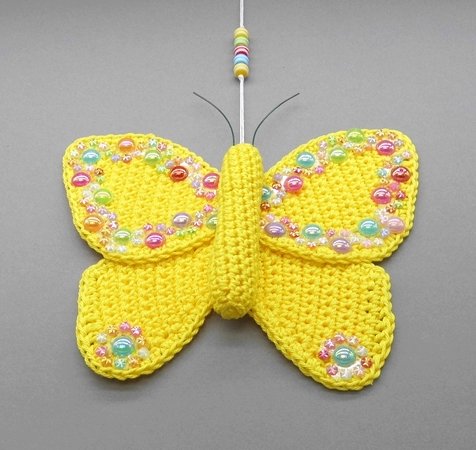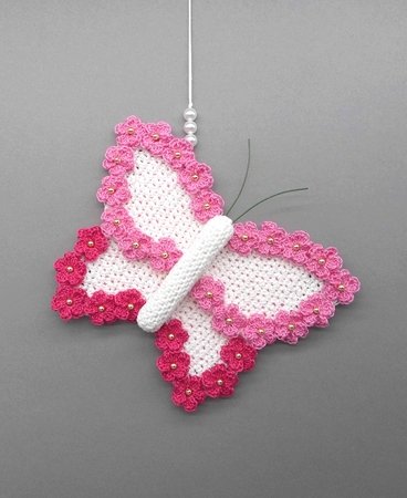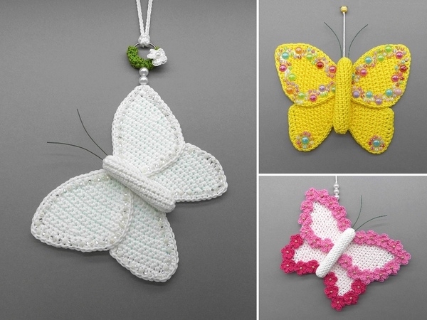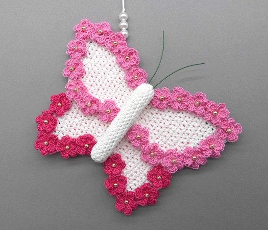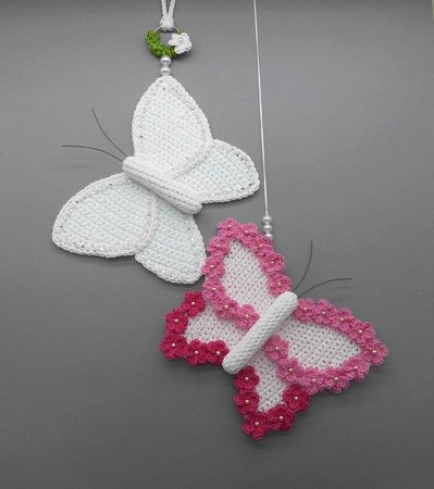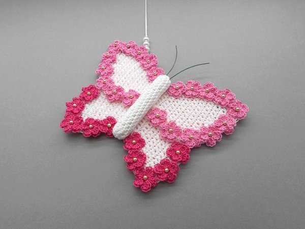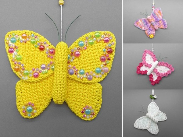 Fortgeschrittene können diese bezaubernde Schmetterlings-Deko ganz einfach nachhäkeln und dann ganz individuell mit Perlen, kleinen Häkel-Blümchen oder Glitzersteinen dekorieren.