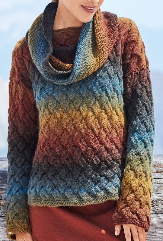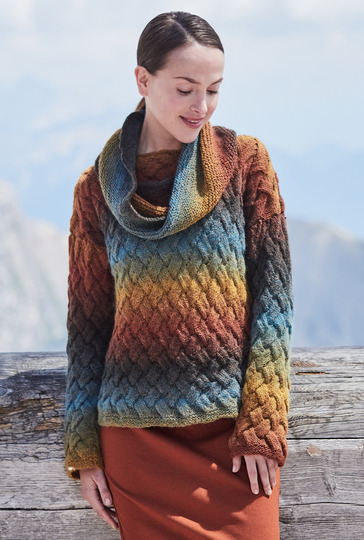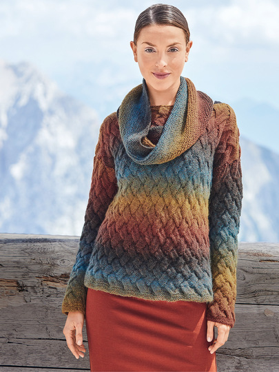 Petrol – die ungewöhnliche Farbenpracht des Verlaufgarns bekommt durch die gleichmäßigen allover verteilten Flechtstrukturen noch intensivere Aussagekraft. Mit passendem kraus rechts gestrickten weiten Loop ein echtes Outdoor-Highlight. Vorder- und Rückenteil sind einfach zwei Rechtecke; es entsteht somit ein U-Boot-Ausschnitt. Saum- und Ärmelbündchen werden kraus rechts gearbeitet. Das geflochtene Zopfmuster erfordert etwas mehr Aufmerksamkeit, ist aber mit der genauen Strickschrift keine allzu große Hürde. Eine Anleitung gibt es für die Größen 38/40, 42/44) und 46/48.