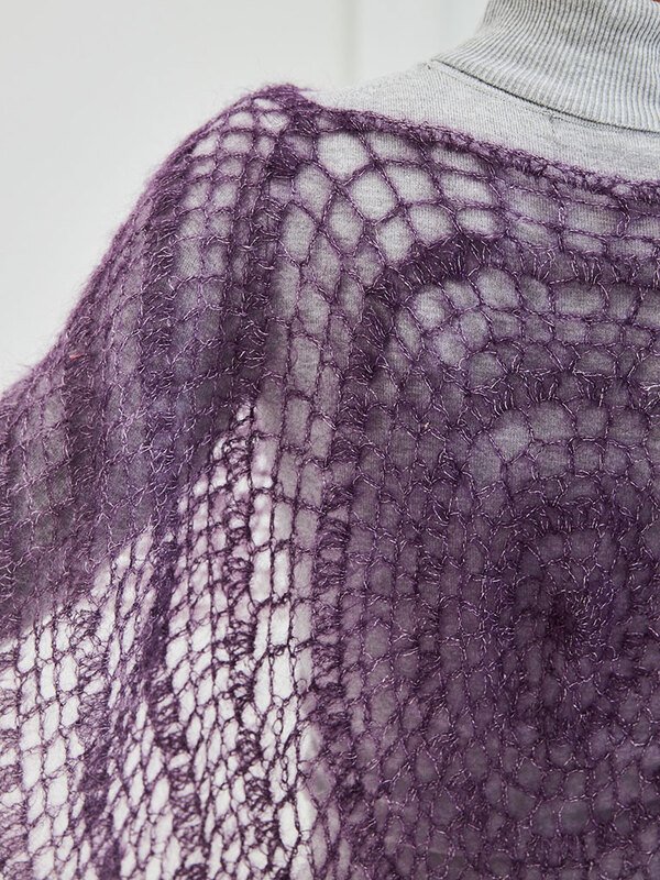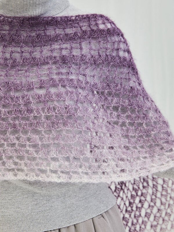 Dieser hier ist aus der Woolly hugs LACE gehäkelt und ihr braucht nur eine einzige Kone für diesen hübschen Poncho. Durch das große Lochmuster bekommt ihr mit nur einer Kone einen sehr großen Poncho der weit über den Po reicht. Für dieses Beispiel wurde die Modefarbe Pflaume gewählt welches von Weiß nach Dunkel verläuft. Alle Konen haben den gleichen Farbverlauf so das ihr wirklich genau diesen Poncho nachhäkeln könnt.