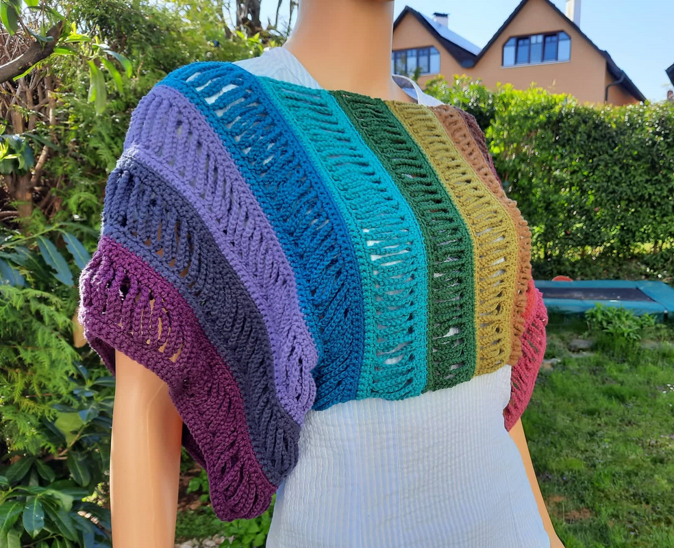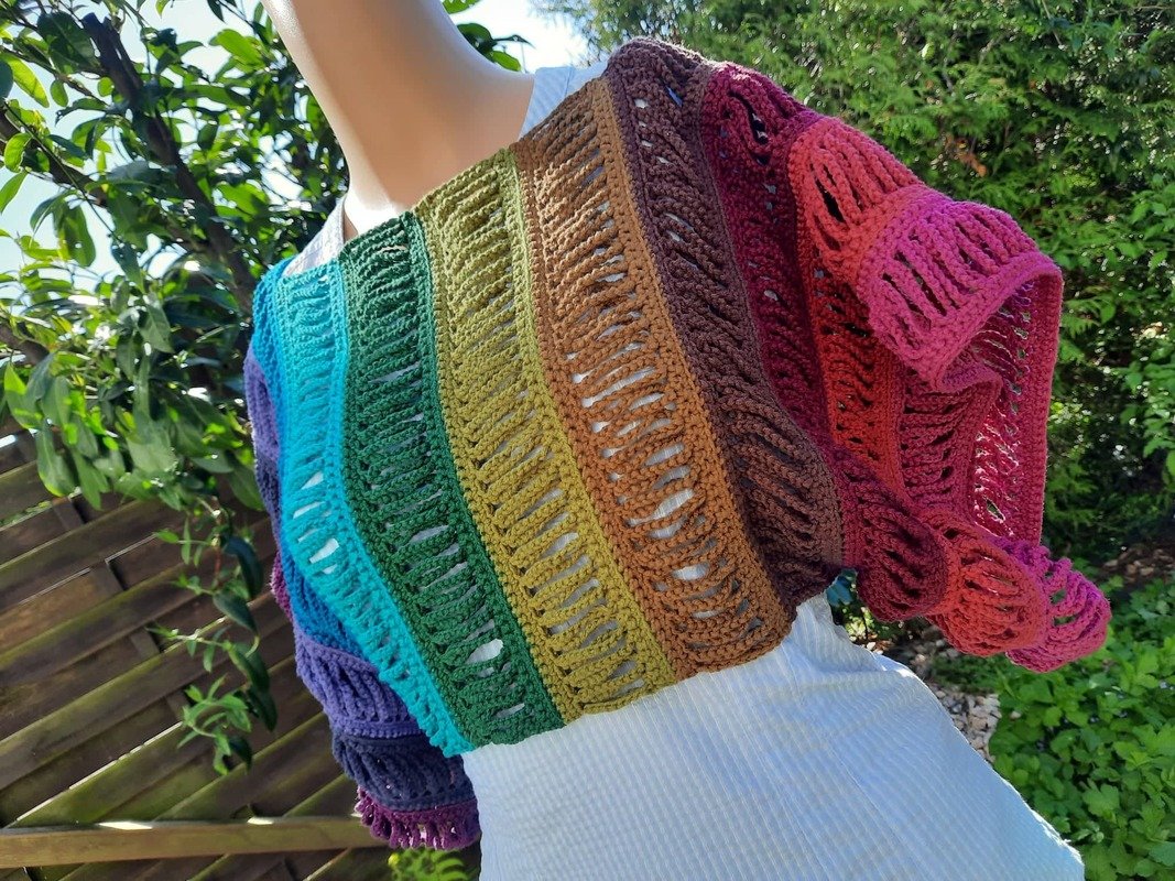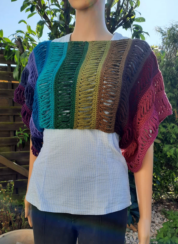 Der bunte Kurzpulli (Poncholero) misst 37 cm x 85 cm