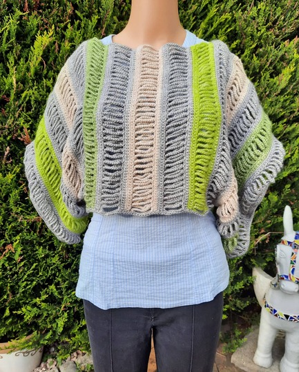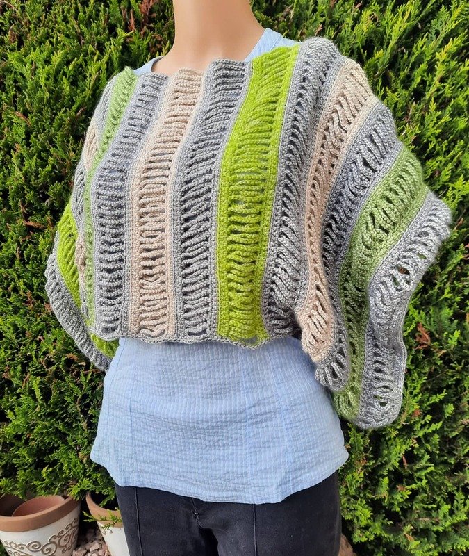 Der Kurzpulli (Poncholero) in grau/beige/grün misst 42 cm x 95 cm