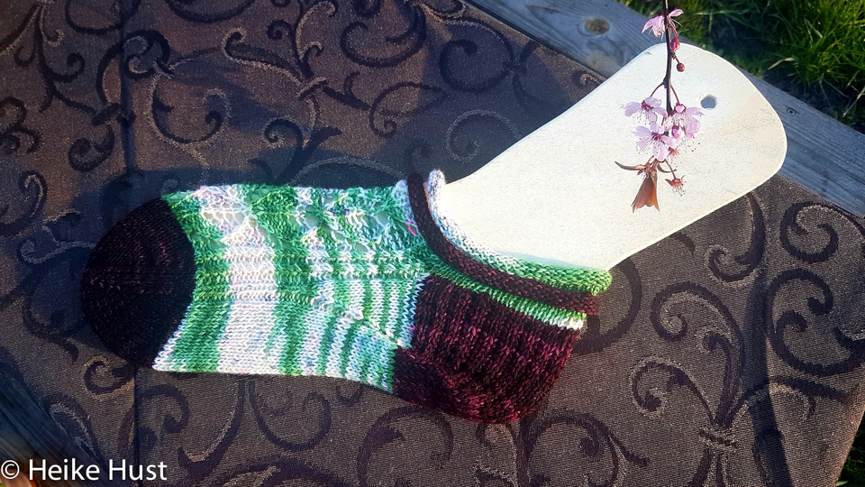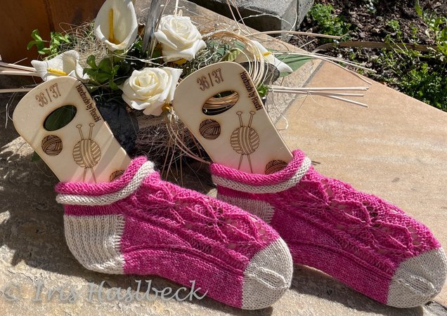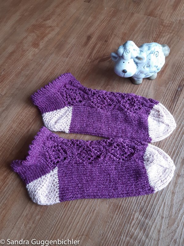 In dieser Anleitung ist das doppelte Rollrandbündchen, die Hufeisenferse und die Bandspitze beschrieben. Es kann aber beliebig ausgetauscht werden.