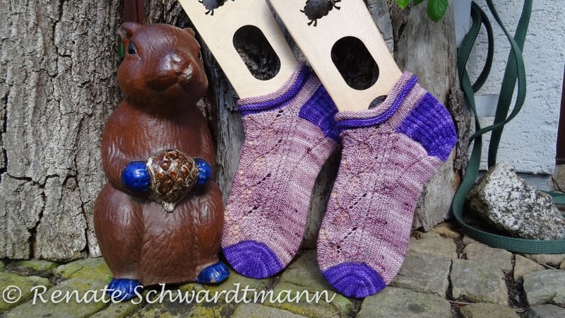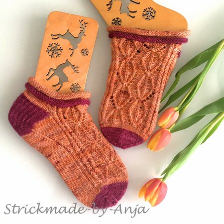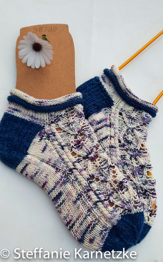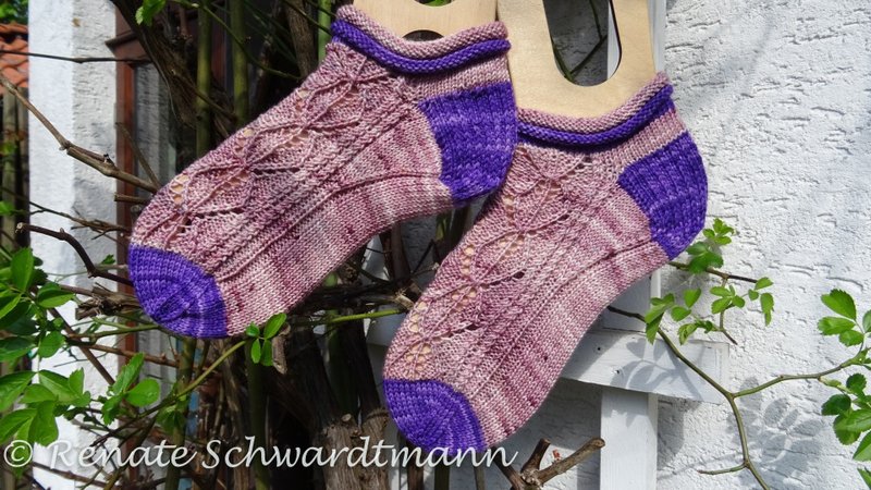 Wunderschöne Sneakersocken mit einem feinen Ajourmuster auf dem Oberfuß, einem doppelten Rollrandbündchen und einer Hufeisenferse.