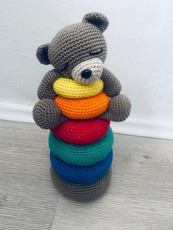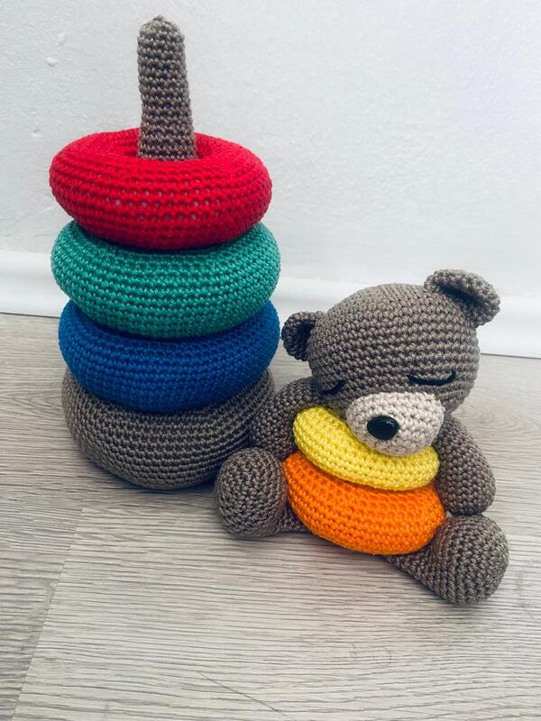 Ein weiches Babyspielzeug zm greifen und ordnen mit Stapelringen und einem Bärenkopf. Schritt für Schritt Anleitung mit vielen Bildern
