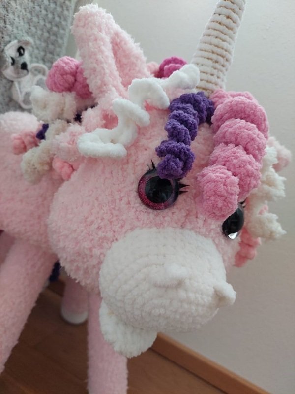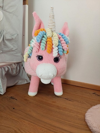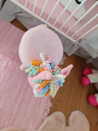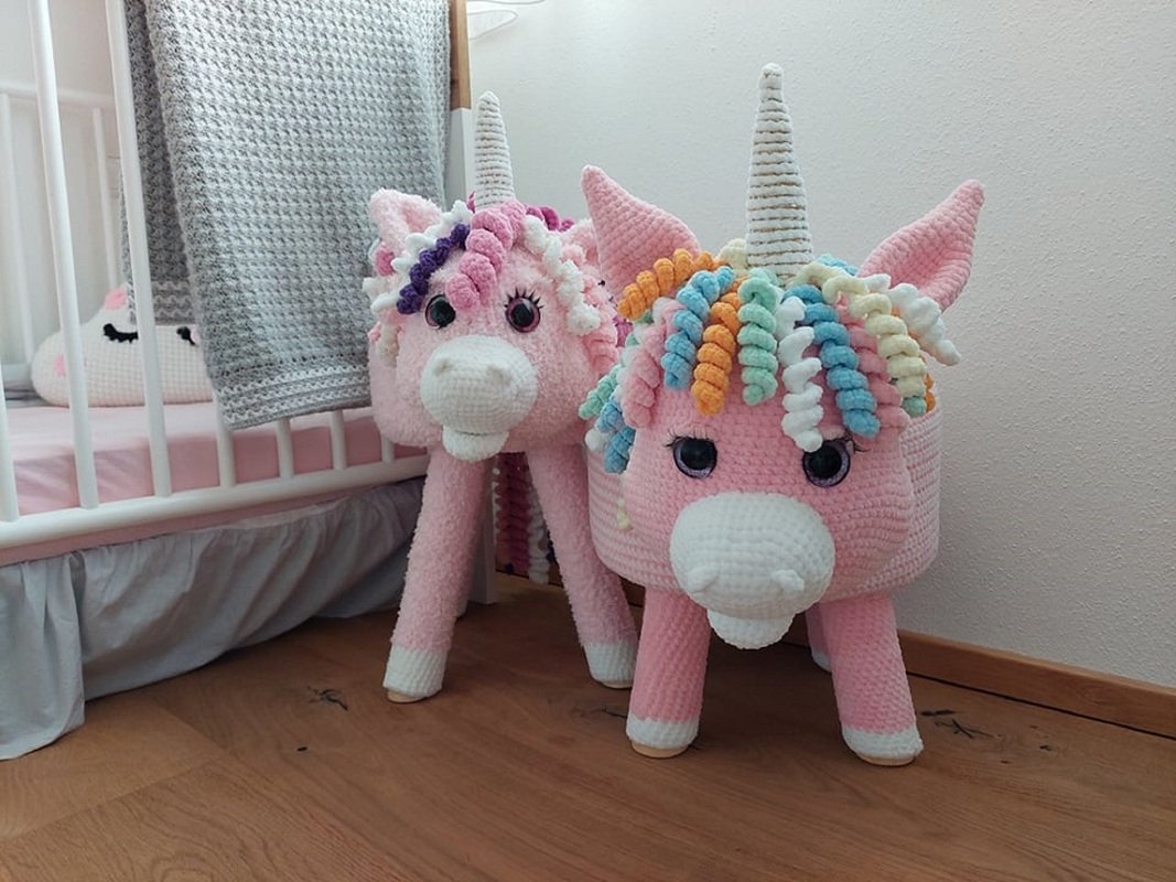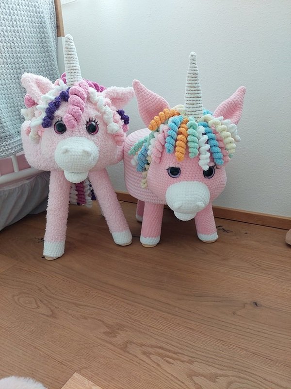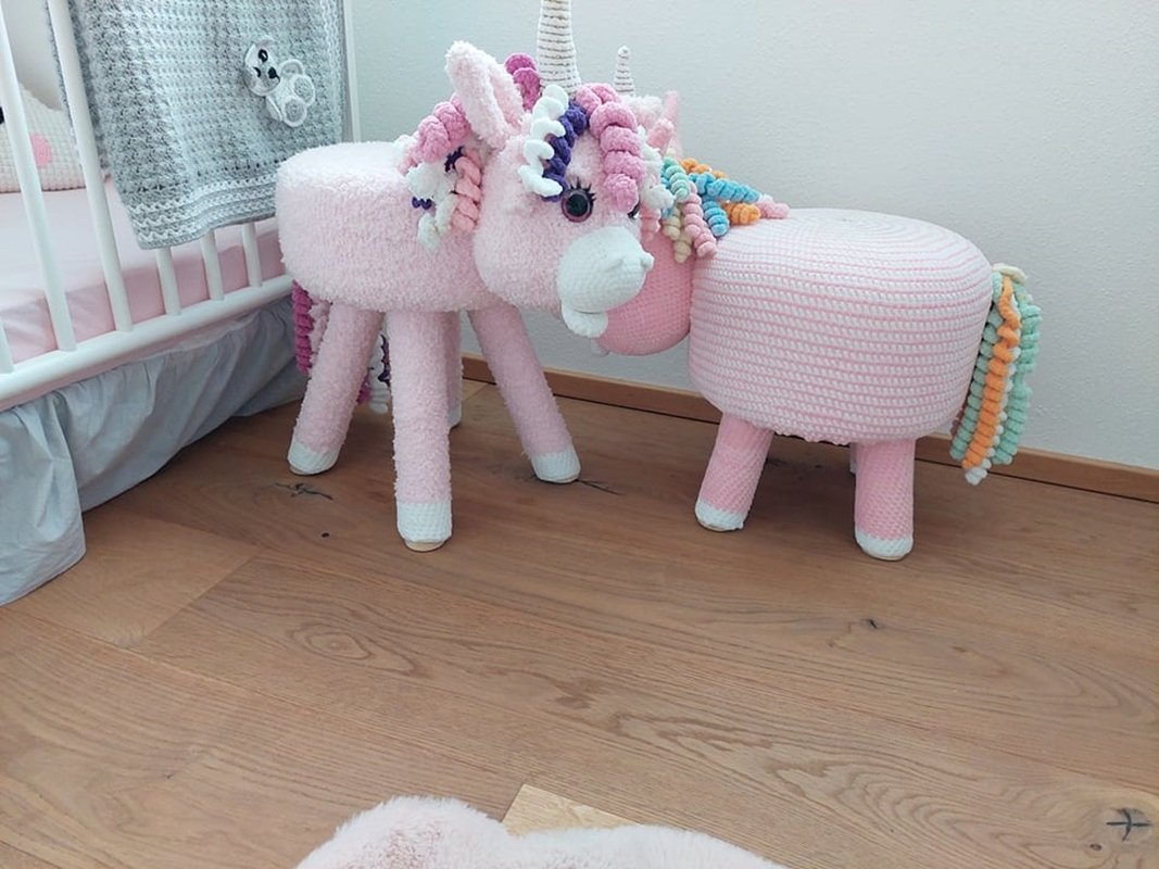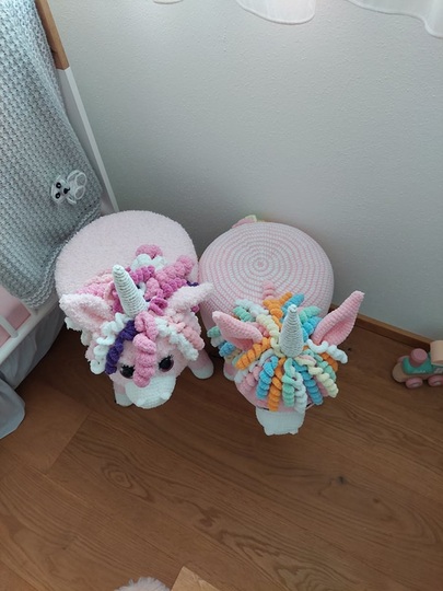 Zuerst habt ihr das Vergnügen beim häkeln und wen euer Einhorn Hocker in die Kinder Hände abgegeben wird erfreut ihr euch an leuchtenden Kinderaugen.