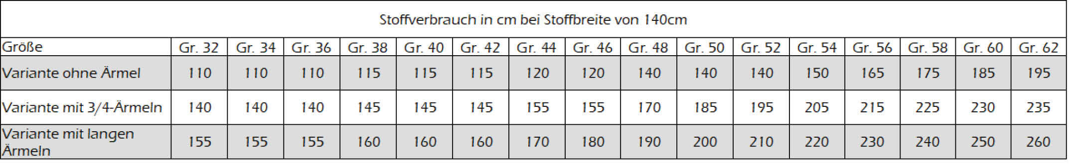 Im Schnittmuster enthalten sind die Damengrößen 32 - 62.