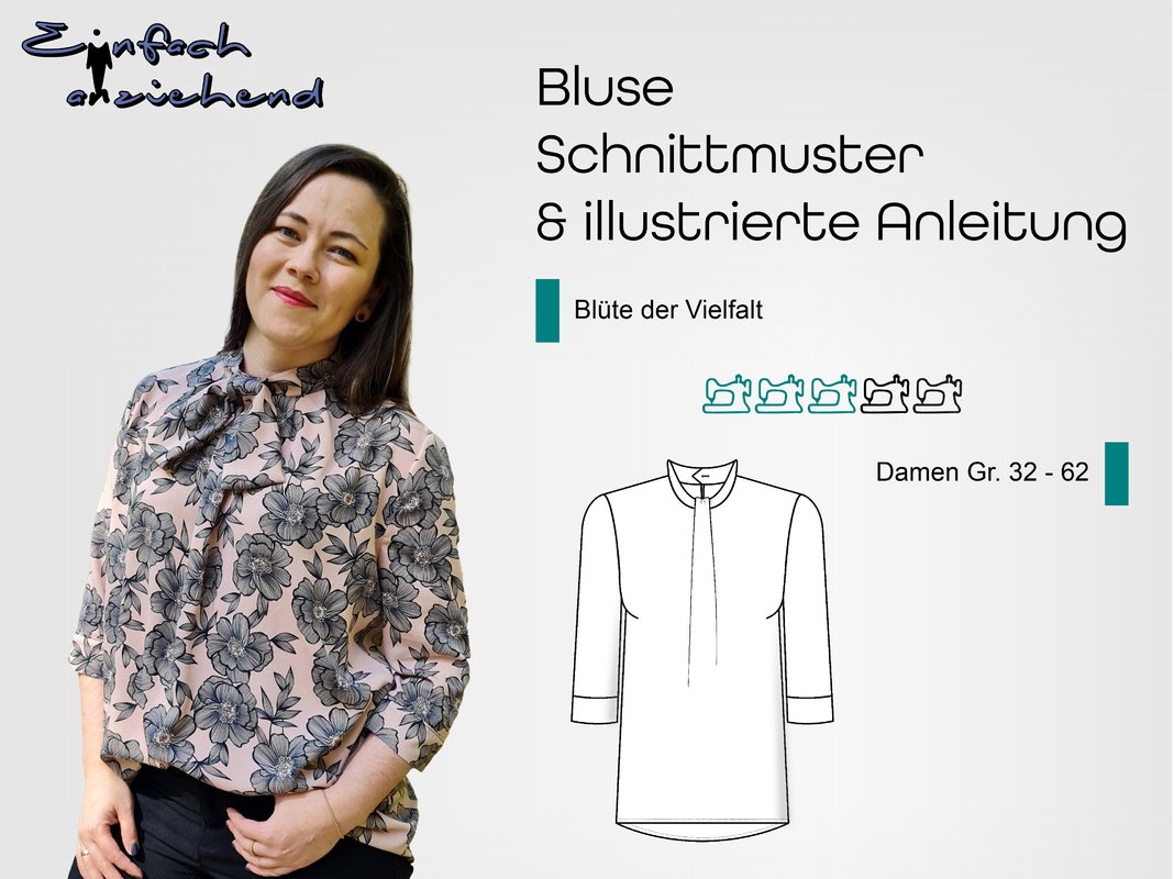 Die Natur verblüfft uns immer wieder mit ihrer Vielfalt und Einzigartigkeit. Beim Nähen können wir uns frei entfalten und mit Kreativität und Geschick ebenso wahre Schönheiten zaubern. Die Blüte der Vielfalt lädt dich ein, diese Träume zu verwirklichen. Bei dieser Bluse hast du die Wahl zwischen 2 Ärmellängen oder einer ärmellosen Bluse, 2 Faltenoptionen der vorderen Mittelfalte und einem absoluten Clou: Eine abnehmbare/auswechselbare Schluppe!