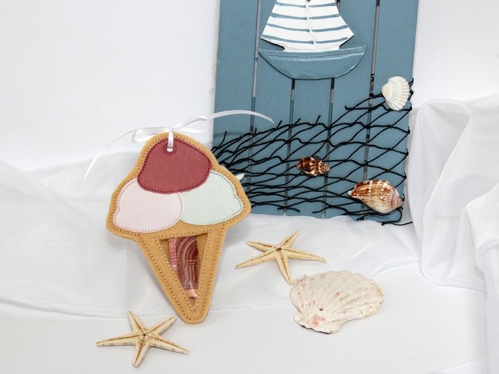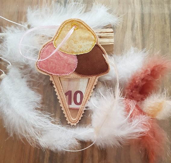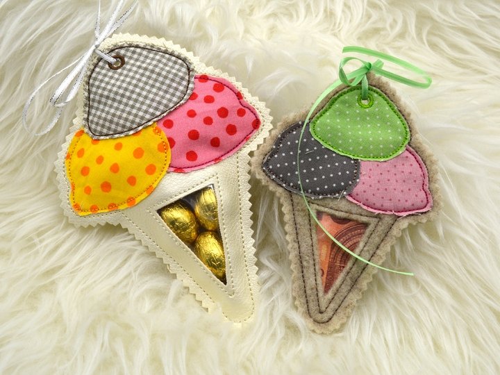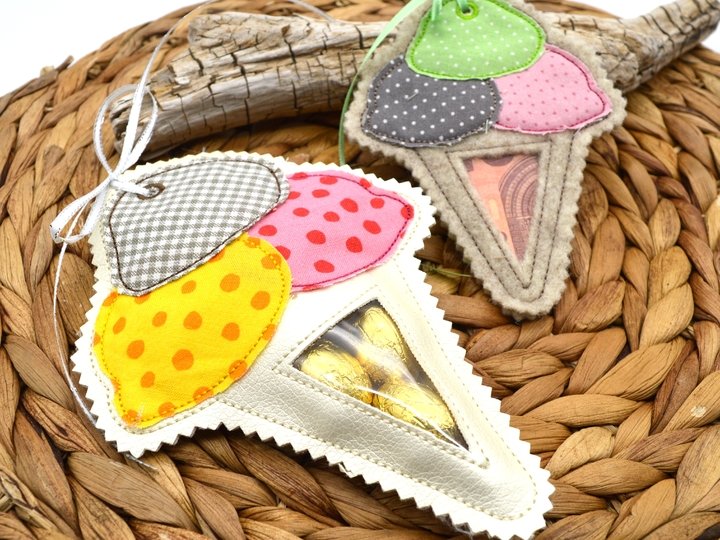 Die Eiswaffeln werden komplett im Rahmen gestickt und nach dem Sticken außen herum ausgeschnitten. Geeignet für Filz/ Kunstleder in der Stärke von 1-1,5mm, enthalten in 2erlei Größen. Beim Ansticken der Rückseite wird oben eine Öffnung gelassen, durch die Süßigkeiten oder Geld gesteckt werden kann.