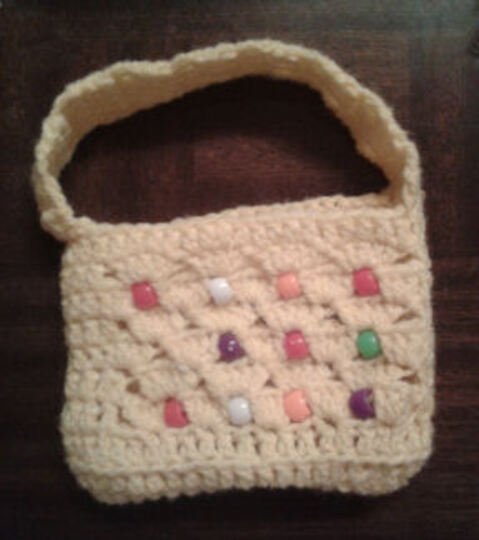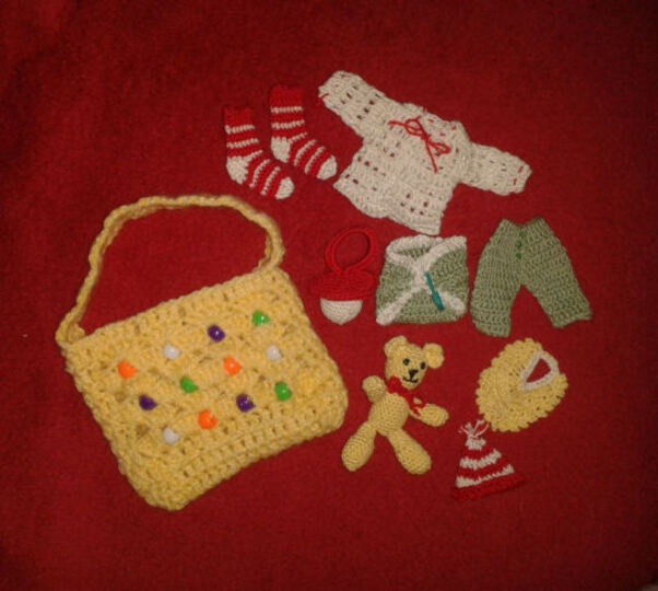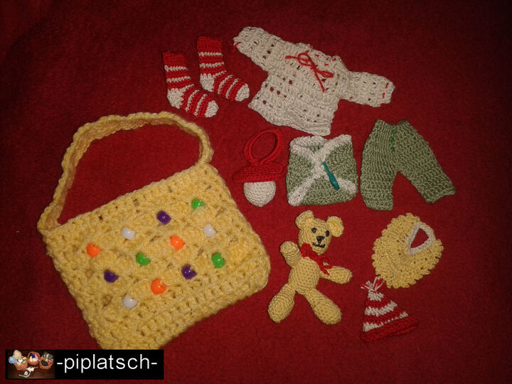 und das alles in einer praktischen, mit Perlen verzierten Tasche.