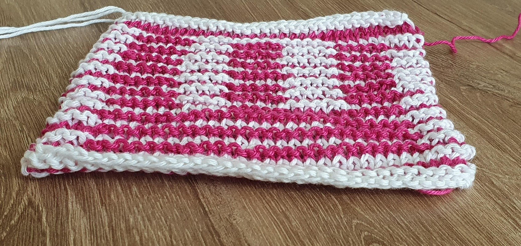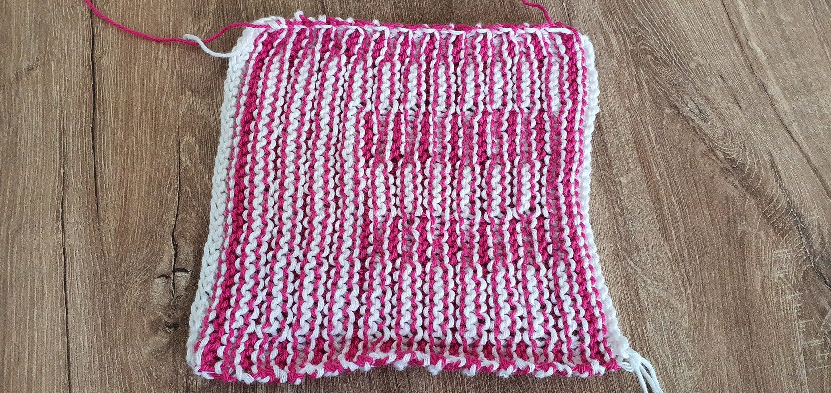 Dabei habe ich 33 Maschen aufgenommen und 23 Hin- und Rückreihen gestrickt.