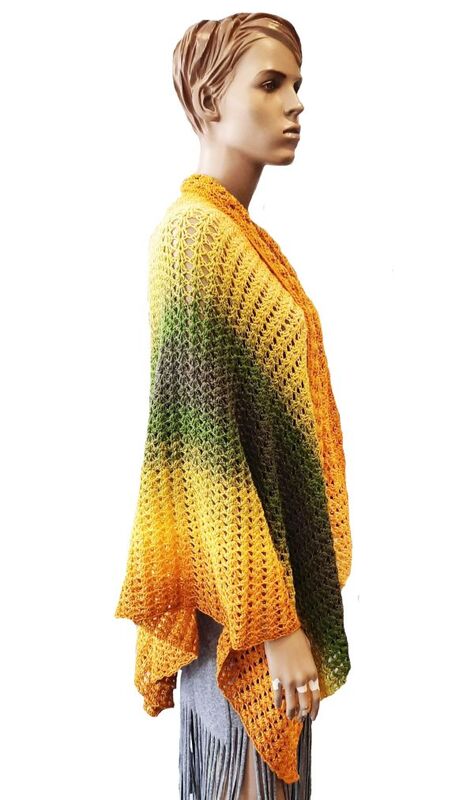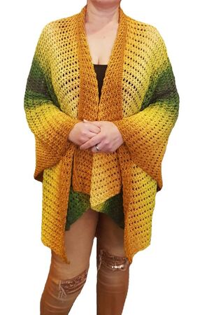 Die Jacke wird von oben nach unten in Reihen gehäkelt. Es ist keine klassische Jacke, denn sie hat Zipfel.
