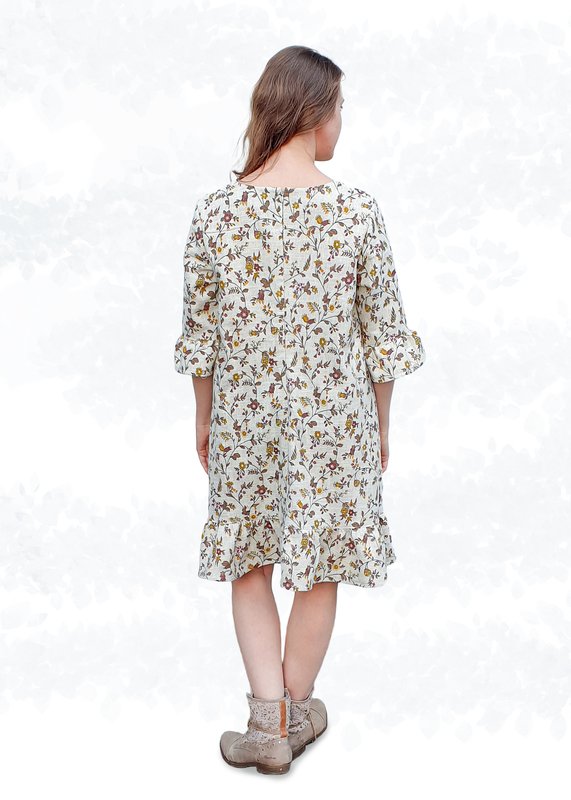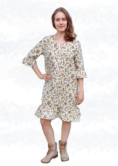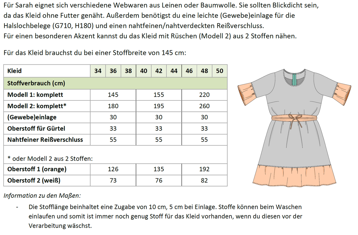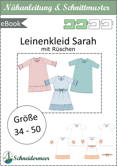 Das Modell „Sarah“ ist ein lockeres Leinenkleid mit Saumrüschen, das durch den Bindegürtel eine schöne Taillierung erhält und so deiner Körperform schmeichelt. Der nahtverdeckte Reißverschluss in der hinteren Mitte sorgt für einen dezenten Verschluss. Das Kleid lässt sich aus verschiedenen Webwaren nähen, wie z.B. Leinen oder Baumwolle. Für einen besonderen Akzent kannst du die Rüschen auch aus Lochspitze gestalten.