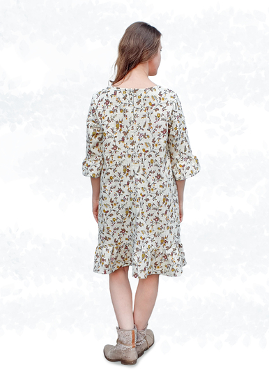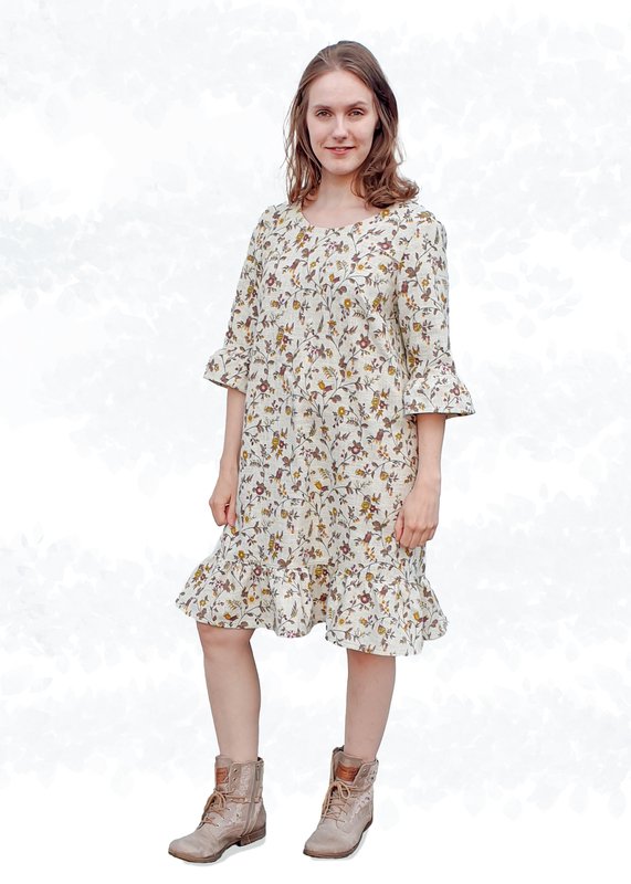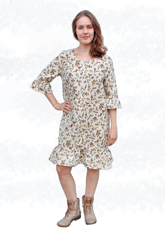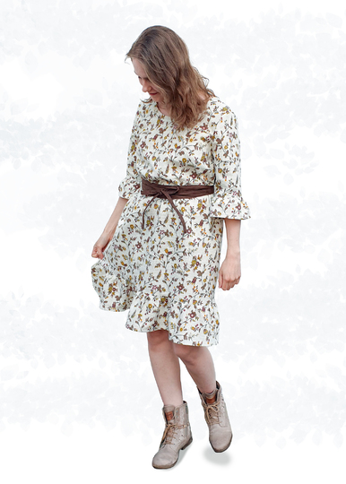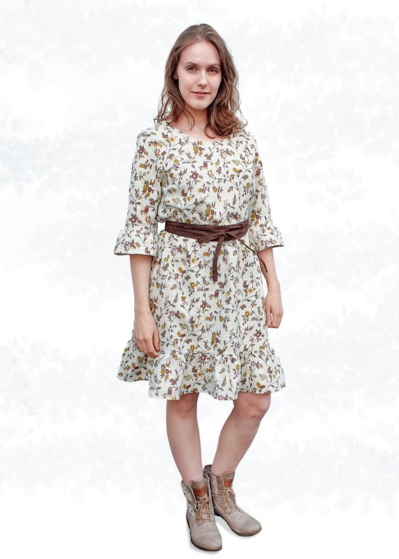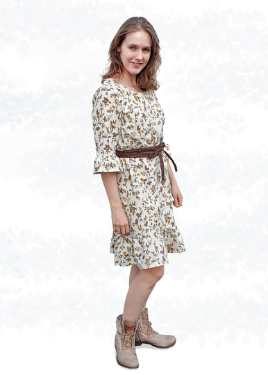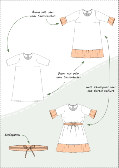 Bei den Ärmeln hast du die Wahl zwischen kurzen oder 3/4-Ärmeln, die entweder gesäumt oder mit Saumrüschen versehen werden können. Dank der A-Linie ist das Kleid auch ideal für die ersten Monate einer Schwangerschaft, wobei der Bindegürtel dann unter der Brust gebunden werden kann.