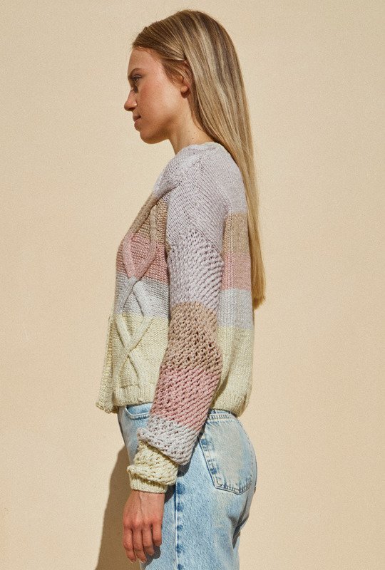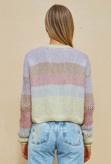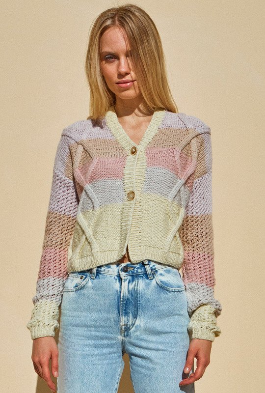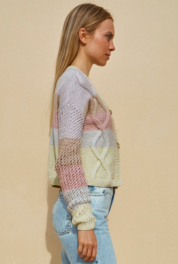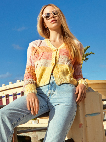 Bei dieser Jacke zeigt sich, wie der Mix aus unterschiedlichen Pastellnuancen sowie Rauten- und Netzstrukturen kreative Lebendigkeit vermittelt, ohne laut zu wirken. Gestrickt wird der hüftlange Cardigan in Einzelteilen von unten nach oben und bis auf die Rippenbündchen mit Nadelstärke 6 – da geht es zügig voran. Das Rückenteil geht besonders schnell, da es einfach nur im Streifenwechsel glatt rechts gestrickt wird. Für die beiden Vorderteile werden die Maschen nach dem Bündchen so eingeteilt, dass die Raute jeweils an den Außenseiten entlangläuft. Das Zopfmuster, das hierfür verwendet wird, ist nicht sonderlich kompliziert, benötigt aber schon ein bisschen Aufmerksamkeit. Die übersichtliche Strickschrift hilft dabei, stets den Überblick über die Verkreuzungen zu behalten. Das Netzmuster für die Ärmel ist dann wieder ganz einfach, lediglich bei den Zunahmen muss darauf geachtet werden, dass sich die Umschläge und zusammengestrickten Maschen weiterhin in jeder Reihe ausgleichen. Sind alle Teile fertig, werden die Nähte geschlossen, die Blenden angestrickt und die Knöpfe angenäht.
