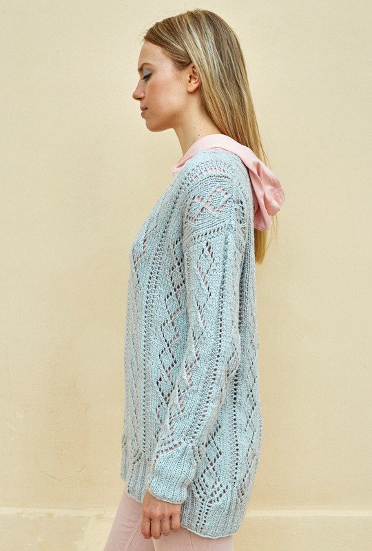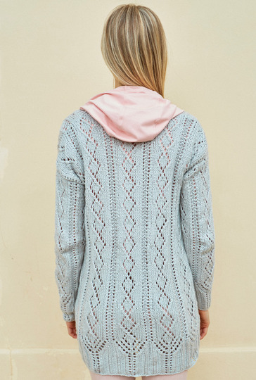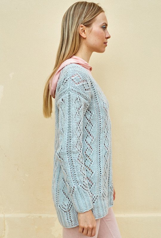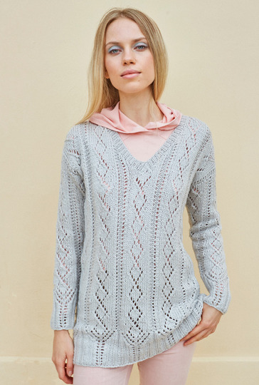 Mit viel Liebe zum Detail fügt sich bei diesem Frühlingspulli eins in das andere. Das aparte Lochmuster schließt sich harmonisch dem Bündchen an und führt dessen Linien ganz sauber weiter. Das hellgraue Garn bietet edlen Lüster sowie Understatement, ohne dem Muster die Show zu stehlen. Gestrickt wird der Baumwollpulli in Einzelteilen von unten nach oben. Gleich nach dem Maschenanschlag ist es schon soweit – du kannst direkt im Muster loslegen und der übersichtlichen Strickschrift folgen. Lediglich bei den Ab- und Zunahmen muss darauf geachtet werden, dass sich die Umschläge und zusammengestrickten Maschen immer ausgleichen. Sind alle Teile fertig werden noch die Nähte geschlossen und die Blende des V-Ausschnitts gestrickt – wie hierbei eine ganz saubere Spitze gelingt, erklärt die Anleitung Schritt für Schritt. Am besten nimmt der fertige Pullover jetzt noch ein kleines Bad und wird im Liegen getrocknet. Dabei schön in Form bringen und glattstreichen – so öffnet sich das Lacemuster und entfaltet seine ganze Pracht.