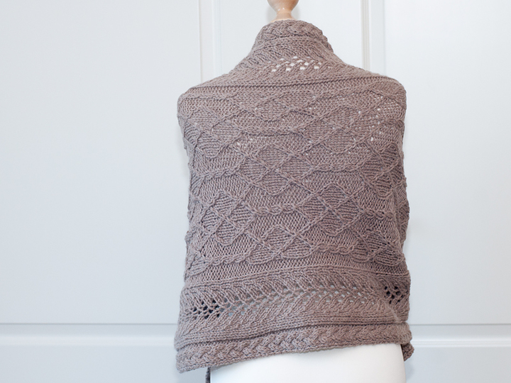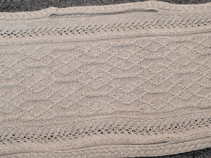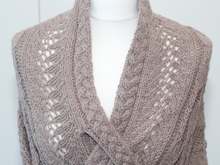 Das Muster ist eine Mischung aus Zopf- und Lacemustern, die alle in einer einheitlichen Strickschrift dargestellt sind.