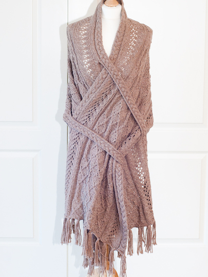 Man benötigt ca. 1000 m 10ply Worsted oder Aran Garn - oder jede andere Qualität, die die Maschenprobe von 17 M und 23 R auf 10 cm ergibt. Die Maße des Schals: 65 x 198 cm (gemessen ohne Fransen).