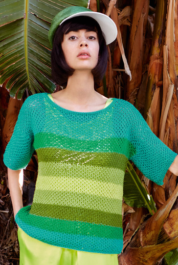 Von Maigrün über Gras bis hin zu Petrol reichen die Farbabstufungen, die dieser hübsche Halbarm-Pulli zu bieten hat. Das Netzmuster aus tiefgestochenen Maschen bringt zusätzlich Bewegung und luftige Frische. Das Muster benötigt schon etwas Aufmerksamkeit, ist jedoch in der Anleitung ganz genau Reihe für Reihe beschrieben. Gestrickt wird das Shirt erst einmal in einzelnen Teilen, wobei die schmalen kraus rechts gestrickten Blenden einen schönen Rahmen für das Netzmuster bilden. Für die kurzen Ärmel werden dann zuerst die Schulternähte geschlossen und die Ärmel direkt von oben nach unten angestrickt. Danach nur noch die restlichen Nähte schließen und auch den Halsausschnitt mit einer schmalen, kraus rechts gestrickten Blende versehen.