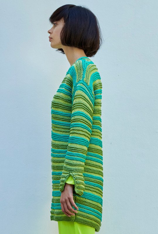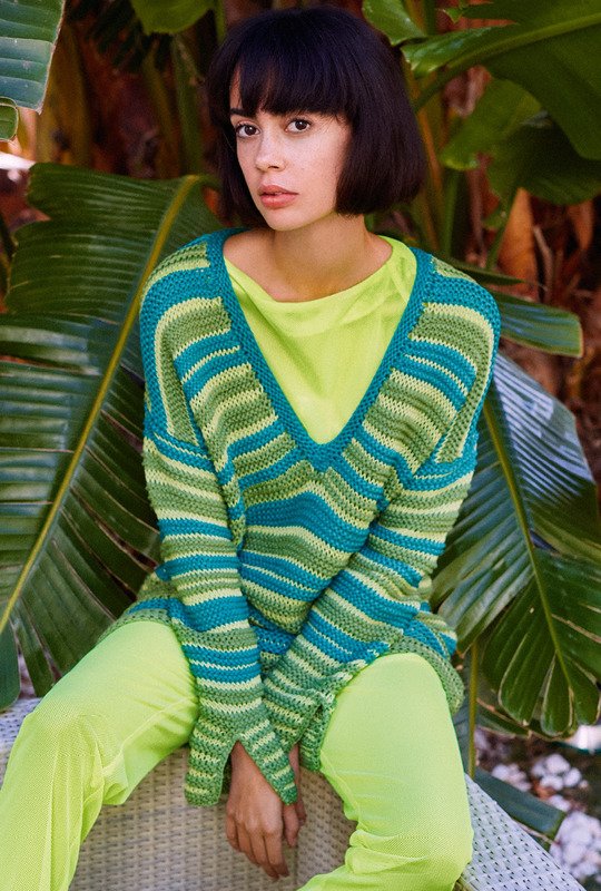 Hier lebt die Masche vom Spiel unterschiedlicher Materialien: Ein voluminöses Dochtgarn, das zusammen mit dünnerer Baumwolle die interessante Optik ergibt. Nicht zu vergessen das erfrischende Farbspiel aus klaren Grüntönen! Das macht gute Laune, bietet viel Strickvergnügen und lässt sich später vielfältig kombinieren. Gestrickt wird in einzelnen Teilen von unten nach oben. Die Muster- und Streifenfolge ist nicht kompliziert und Reihe für Reihe in der Anleitung ausführlich beschrieben. So wächst der Pulli mit Nadelstärke 7 ganz unbeschwert und zügig. Sind alle Teile fertig werden noch die Nähte geschlossen und die Blende des V-Ausschnitts gestrickt – wie hierbei eine ganz saubere Spitze gelingt, erklärt die Anleitung Schritt für Schritt. Währenddessen könnte man bereits über weitere Farbkombinationen nachdenken – denn Streifenpullis kann man nie genug haben.