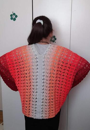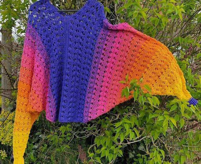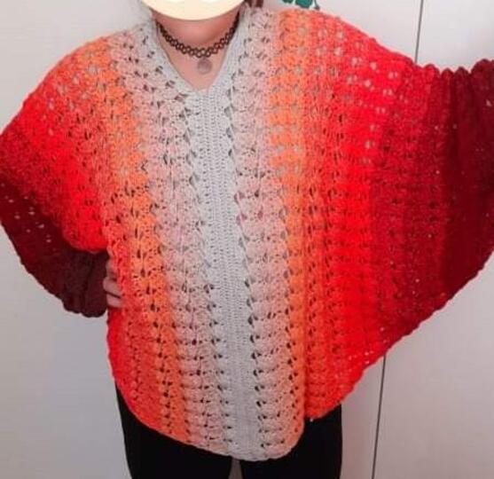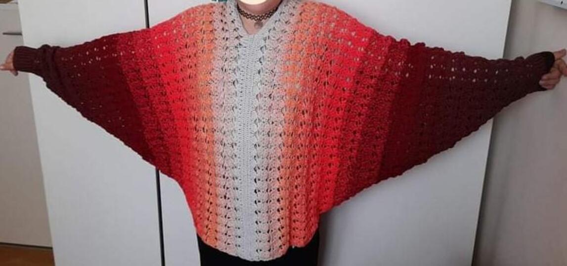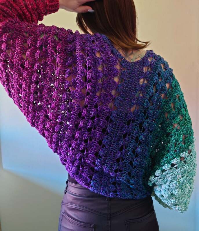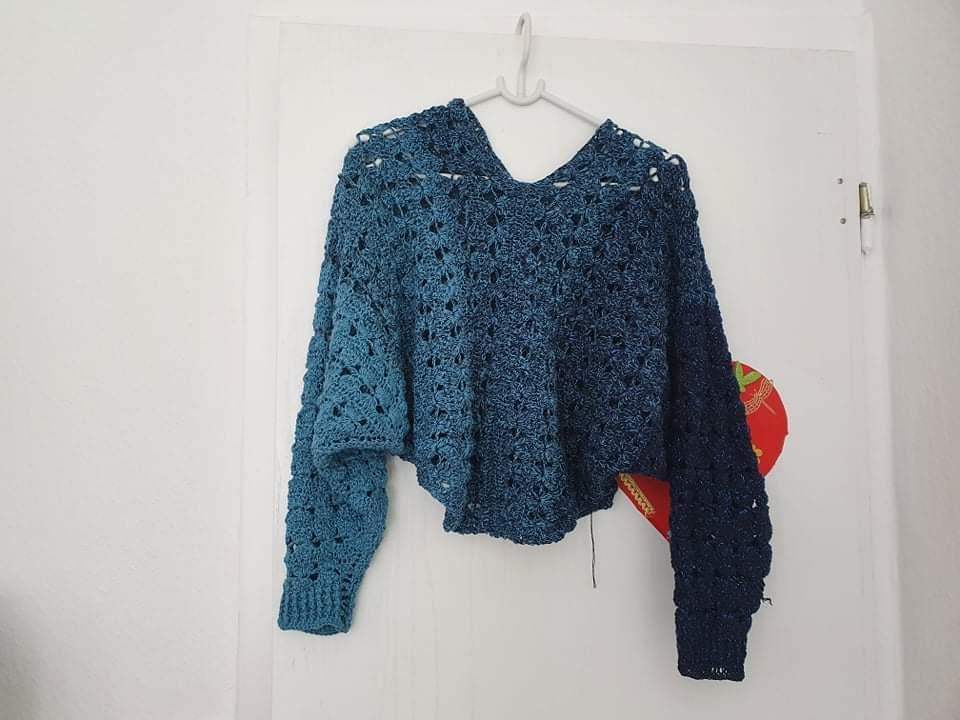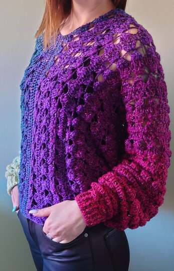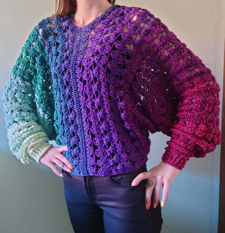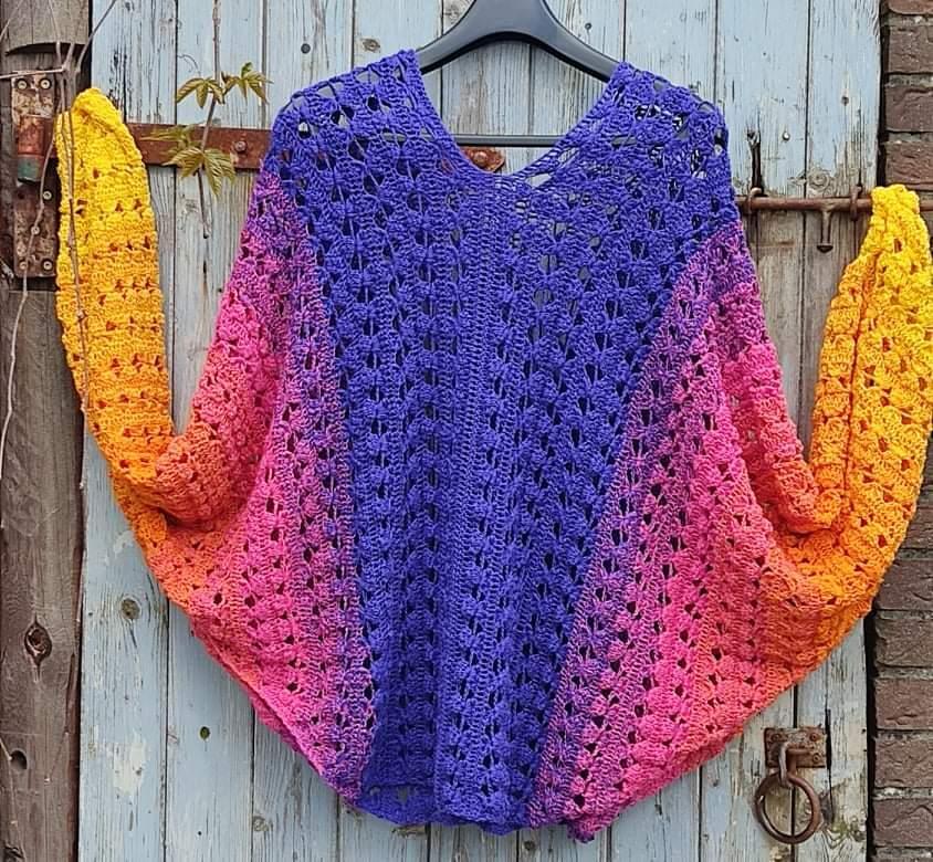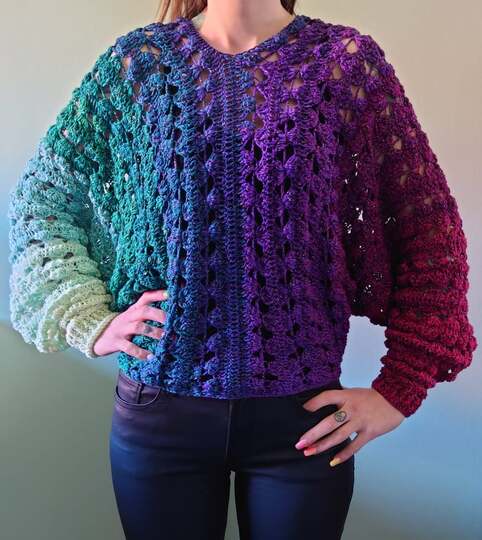 Der Pullover Sabia ist ein hübscher Pullover mit Fledermausärmeln. Er wird komplett an einem Stück gehäkelt. Auch die Ärmel werden direkt mit gehäkelt, weshalb der Pullover super für Farbverlaufsgarn geeignet ist, weil keine seperaten Ärmel-Bobbel benötigt werden.