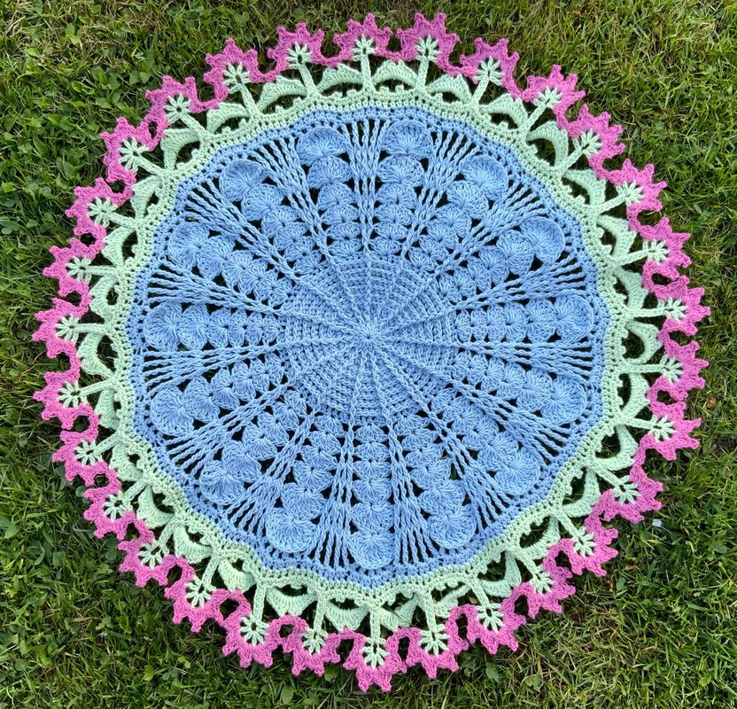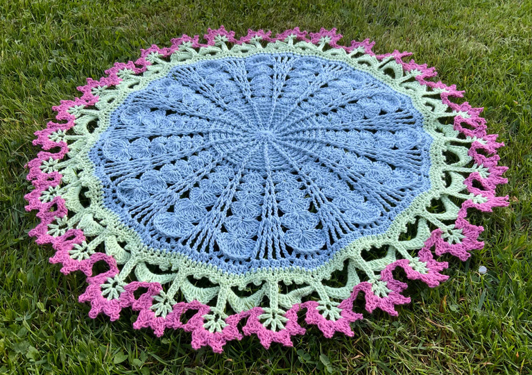 Die runde Tischdecke "BlumenPower!" hat bei 22 Runden Häkelfreude,