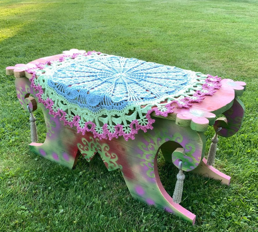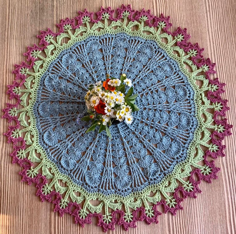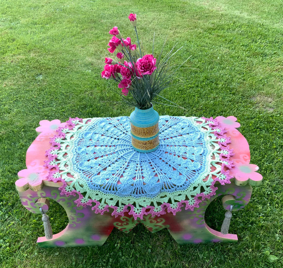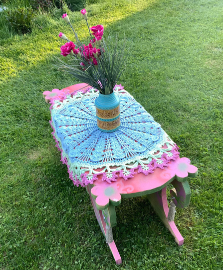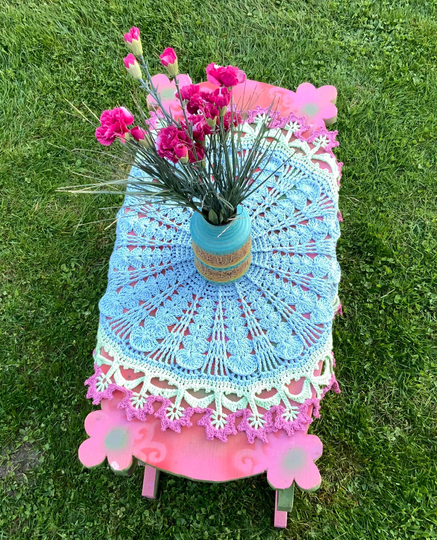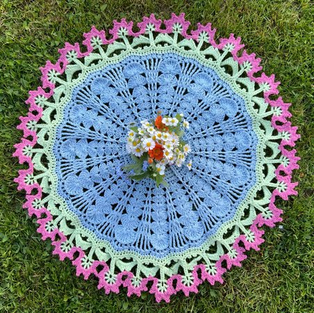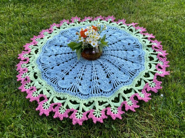 Die runde Tischdecke "BlumenPower!" ....was für ein hübscher, runder Tischschmuck und auch noch ein tolle Handarbeit für alle Häkel-Liebhaberinnen die das Besondere lieben.....toll für den Sommer!