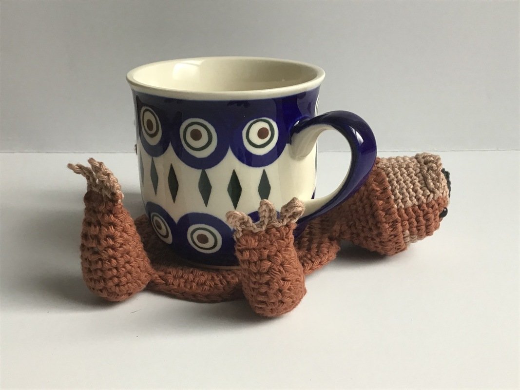 Untersetzer kann man immer gebrauchen und wenn sie noch so einmalig gehäkelt aussehen wie Quentin werden sie gleich noch häufiger von Kindern oder Erwachsenen genutzt. Jedes Häkeltier ist liebenswert.