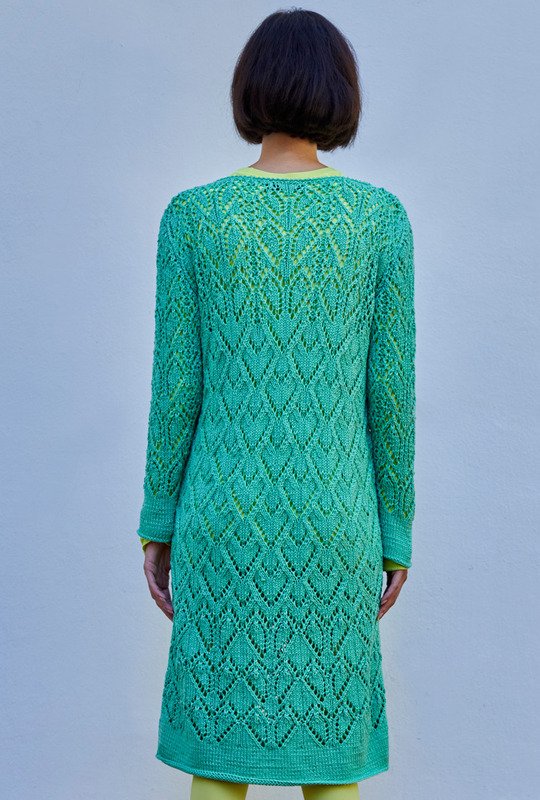 Ob als Kleid oder Tunika getragen – dieses Modell begeistert durch die perfekte Anordnung drei unterschiedlicher Ajourmuster. In leuchtendem Grün ist es zudem ein Ausdruck purer Lebendigkeit. Gestrickt werden Vorderteil, Rückenteil und Ärmel in Einzelteilen von unten nach oben. Begonnen wird immer mit einem glatt rechts gestrickten Bündchen. Dann geht es in der Musterfolge weiter. Nach und nach werden so bei Vorder- und Rückenteil die drei Lochmuster gestrickt. Diese benötigen schon ein wenig Aufmerksamkeit, die übersichtlichen Strickschriften helfen jedoch dabei, stets den Überblick zu behalten. Lediglich bei den Ab- und Zunahmen muss darauf geachtet werden, dass sich die Umschläge und zusammengestrickten Maschen immer ausgleichen. Die Ärmel werden lediglich in einem Ajourmuster gearbeitet, so wird die Gesamtwirkung nicht zu unruhig. Zum Schluss werden noch die Nähte geschlossen und der Halsausschnitt umhäkelt – fertig ist die luftig-leichte Tunika.