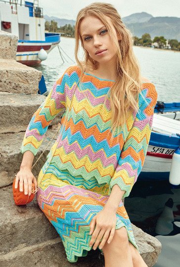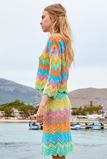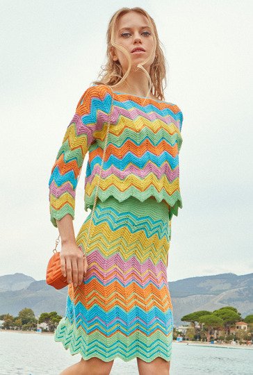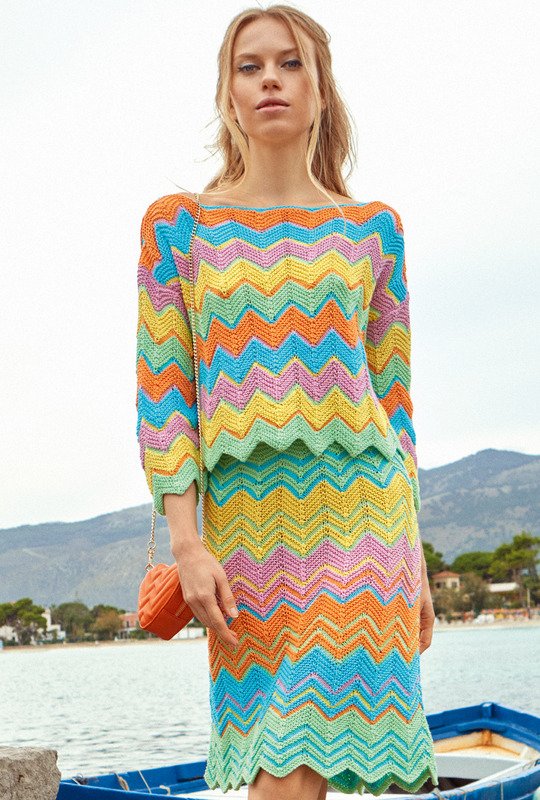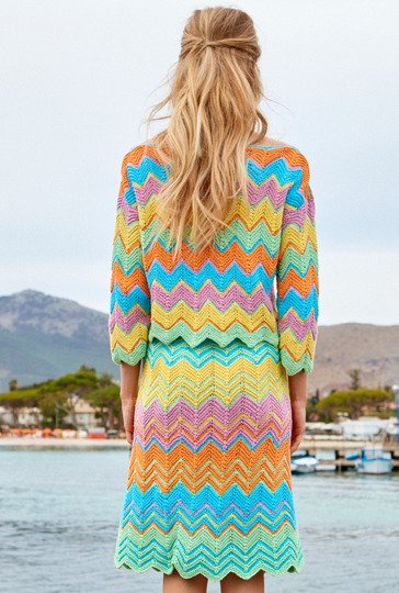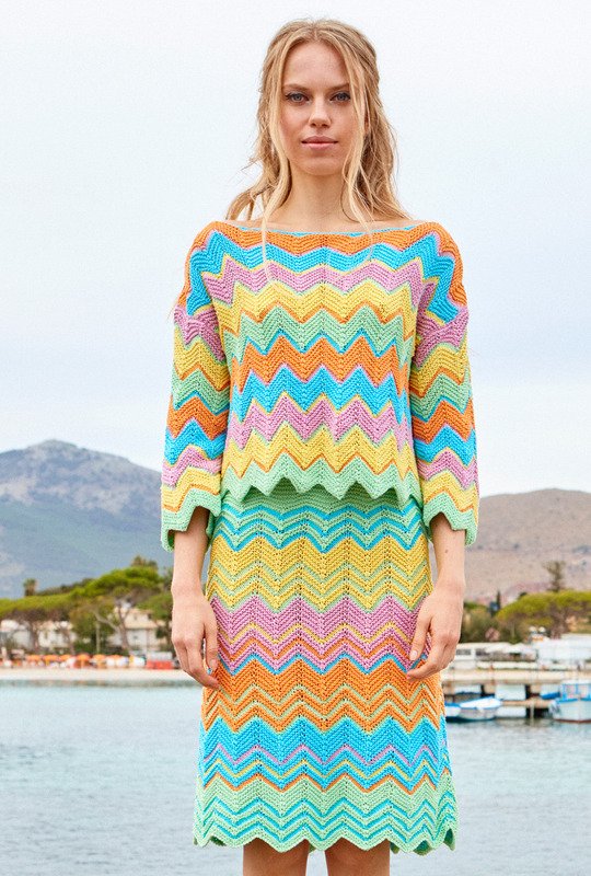Ein echtes Statement für gute Laune und Lebenslust! Frei nach dem Motto "anything goes" wurden bei diesem Ensemble gleich fünf unterschiedliche Töne zackenförmig in Szene gesetzt – Hellgrün, Mauve, Türkis, Gelb und Orange wirken gemeinsam ebenso harmonisch, wie fröhlich! Gestrickt werden Pulli und Rock in Einzelteilen und allover im Zackenmuster. Das Muster ist nicht sonderlich kompliziert und wird sowohl für den Pulli, als auch für den Rock ausführlich Reihe für Reihe in der Anleitung erklärt – ebenso die Streifenfolgen. Der Pullover ist besonders einfach, denn hier werden alle Einzelteile einfach gerade hoch gestrickt. Bei dem Rock muss bei den Abnahmen darauf geachtet werden, dass sich Umschläge und zusammengestrickte Maschen im Muster stets ausgleichen. Ist alles fertig, werden noch die Nähte geschlossen und in den oberen Rand des Rocks ein Taillengummiband eingezogen.