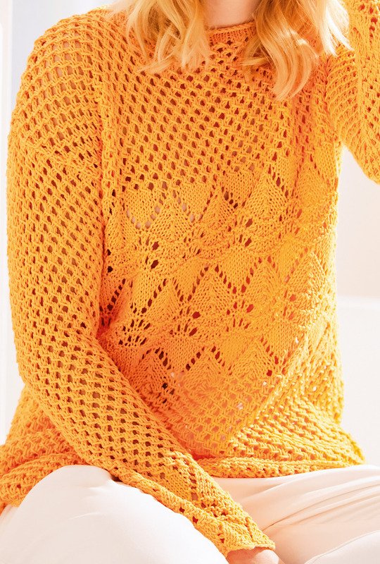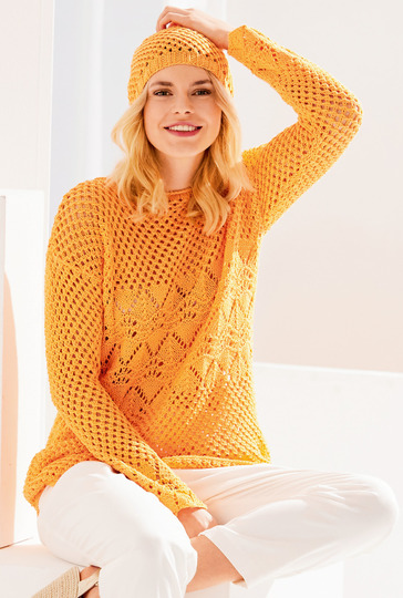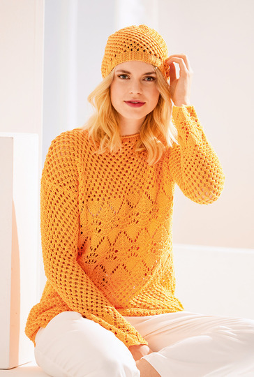 Wow - Welche Leuchtkraft! Mit der Sonne um die Wette strahlen - das ist mit dem Pulli und der sommerlichen Kopfbedeckung aus reinem Baumwollegarn überhaupt nicht schwer. Der heitere Orangeton ist im Frühling und Sommer super angesagt. Das transparente Netzmuster, das am Rückenteil und Vorderteil des Pullovers von einem filigranen Ajourmuster getrennt ist und an den Ärmeln durchgängig verläuft, lässt viel Haut durchblitzen. Dazu gesellt sich die fröhliche Mütze als modisches Accessoires, die zwar nicht wärmt, das sonnige Outfit jedoch modisch aufwertet. Mit dieser Strickanleitung mit mittlerem Schwierigkeitsgrad, können Strickereinnen den Pullover in den Größen 38/40 und 44/46, die Mütze für Kopfumfang 50 - 52 stricken.