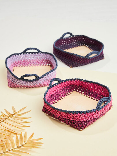 Für einen schönen aufgeräumten Tisch braucht man Körbe. Diese hier sind so schön, da braucht man gleich mehrere von. Aus einem Strang Woolly Hugs ROPE PLAIT beikommt ihr drei Stück. Solch ein Strang besteht aus 7 Farbabschnitten die auf einander abgestimmt sind. So passen die 3 Körbchen farblich immer perfekt zusammen. Die Standfestigkeit ergibt sich aus dem Holzboden. Dort sind die Löcher schon vorgebohrt und ihr müst nur noch häkeln. Als Maschen habe ich einen speziellen Stich mit den festen Maschen gewählt. So sitzen die Maschen richtig gut aufeinander und nichts wird sich verziehen.