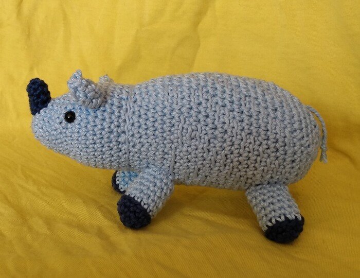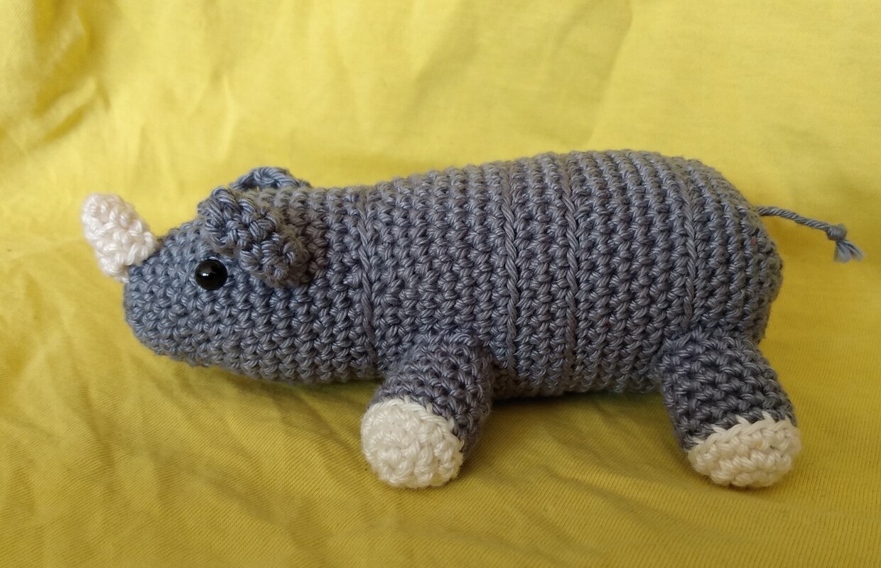 Zusammengenäht wird das Nashorn etwa 13 cm lang, 9 cm breit und 6 cm hoch. (Achtung, bei anderer Nadelstärke wird dein Nashorn natürlich größer oder kleiner.)